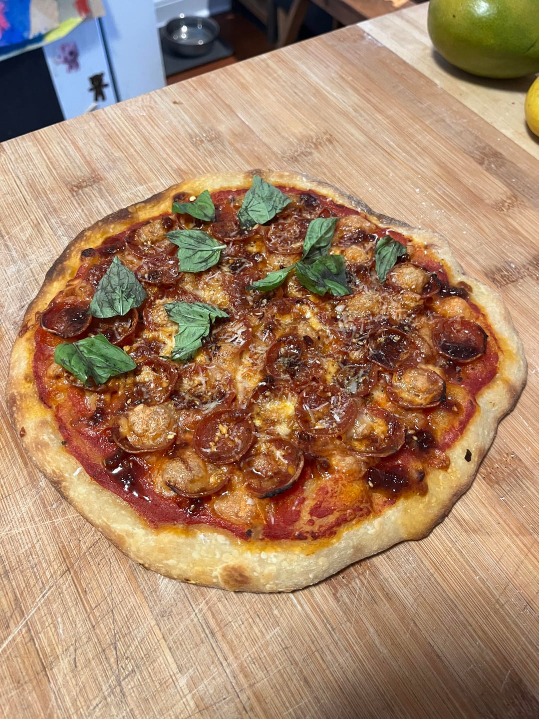 Topped with Castelli Passata, Chili flakes, oregano, parmigiano reggiano, ezzo pepperoni, torn bocconcini (drained and dried a bit). Basil, miso chili oil and grated pecorino after it came out.
