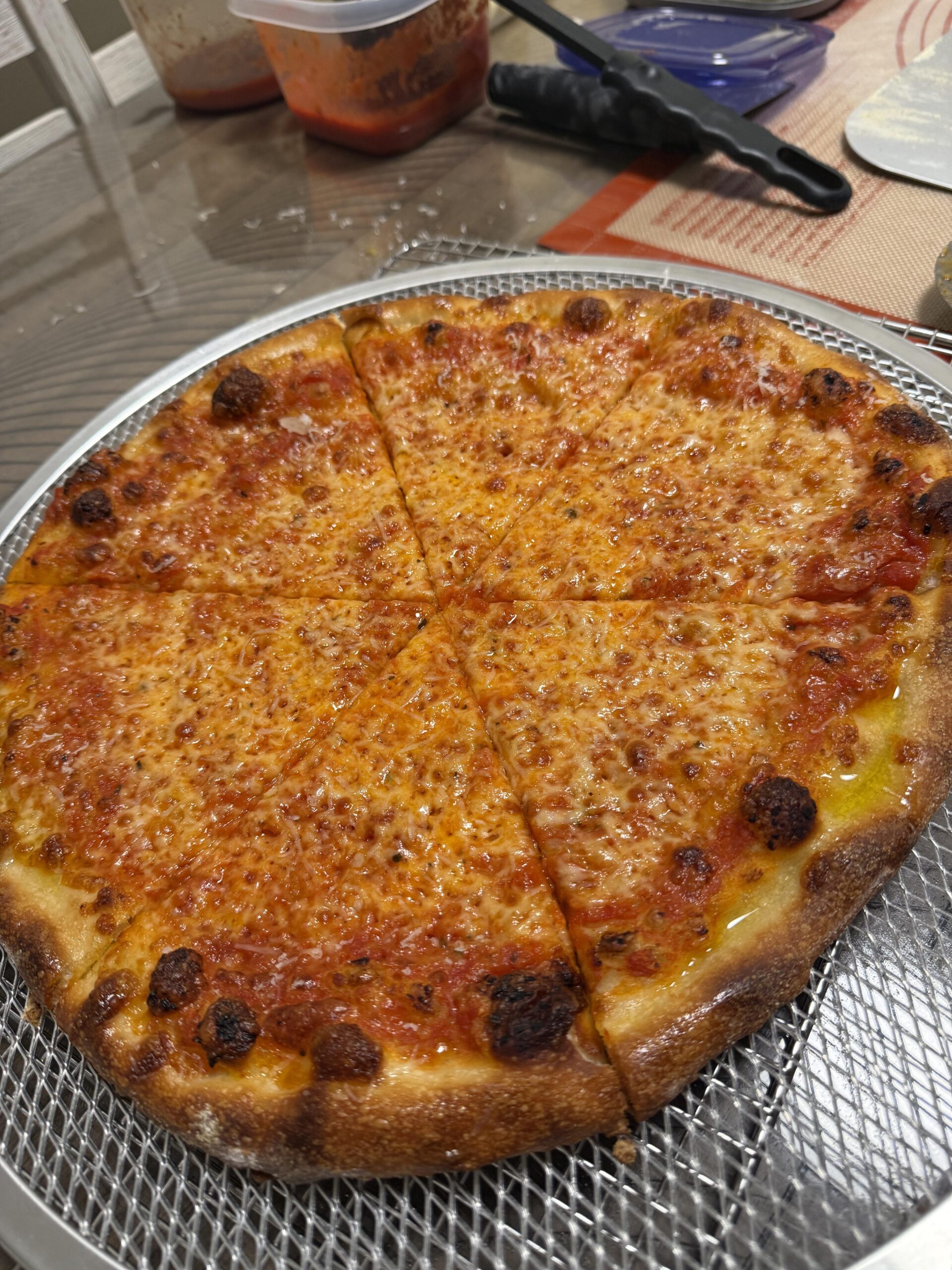 Looks great – honestly – but looks like you spilled a bottle of olive oil all over it after you took it out. What happened? Otherwise you’ve nailed NY style.