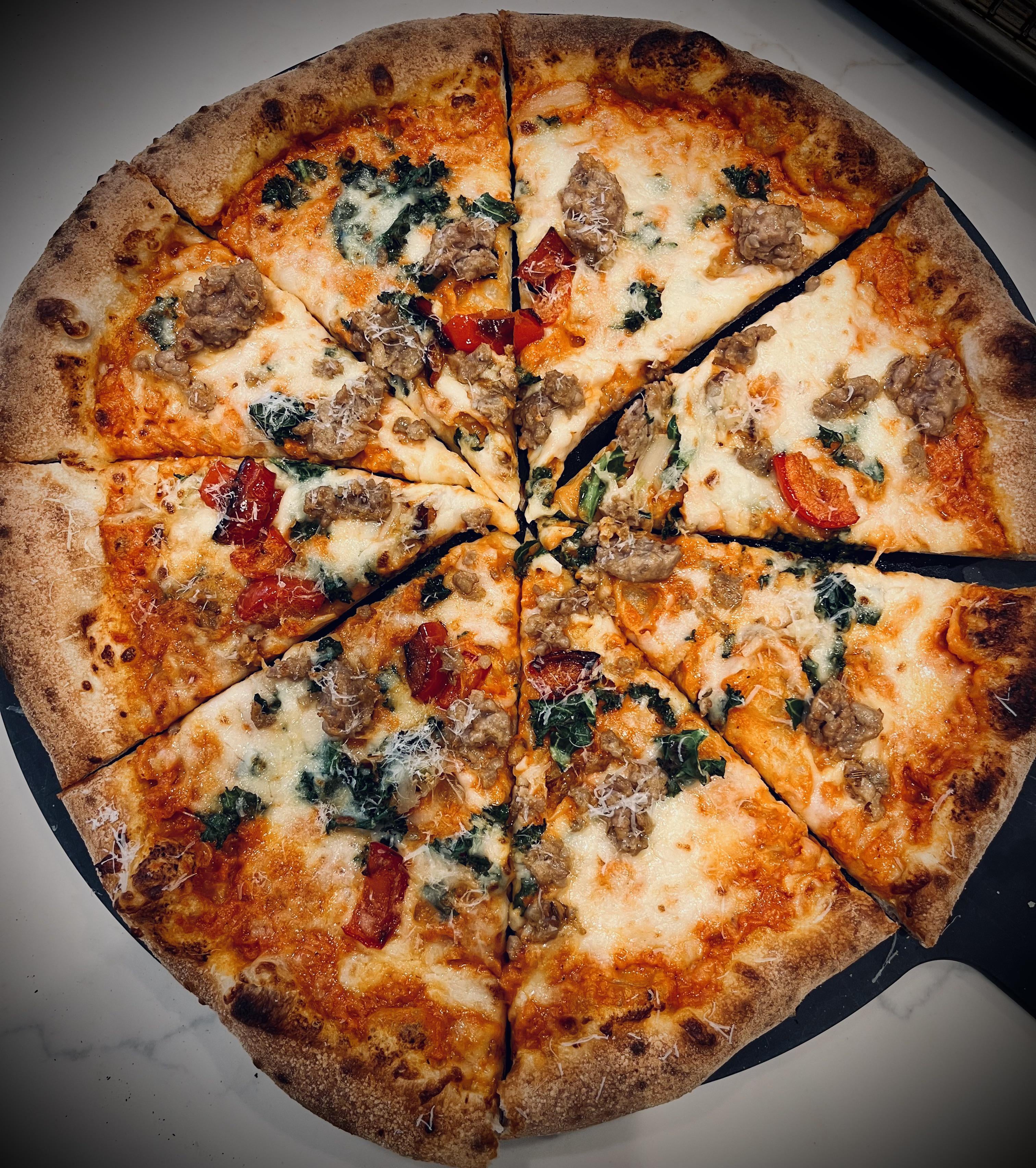 Vodka sauce, roasted garlic, sausage, kale, roasted pepper. 48 hr CF, 59% hyd, in a Dome S1. Glad the weather is getting nicer for outdoor cooking. by pete_987 outdoor ovenpizzaWrite A CommentYou must be logged in to post a comment.