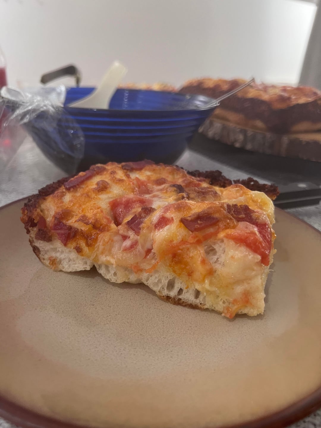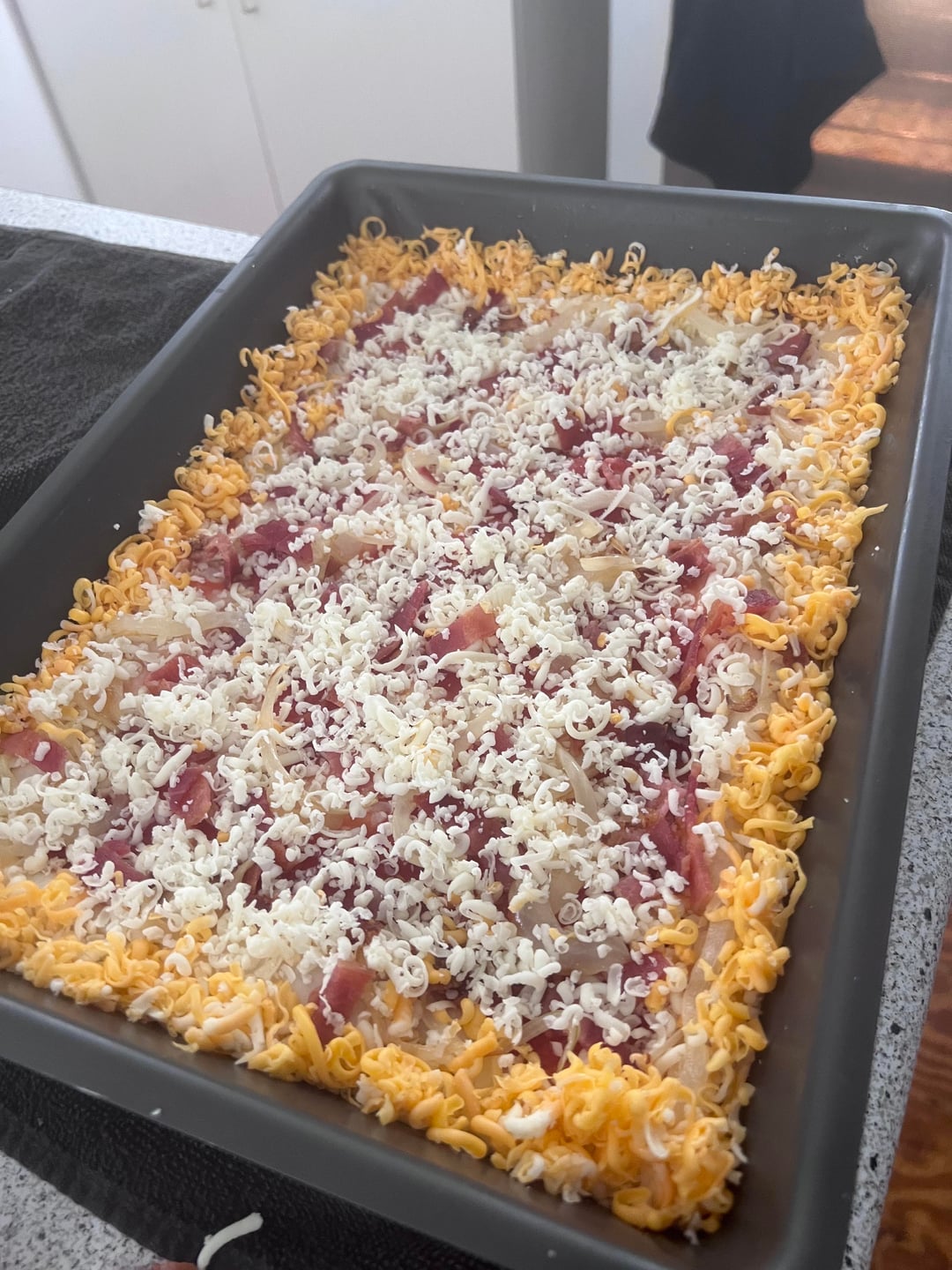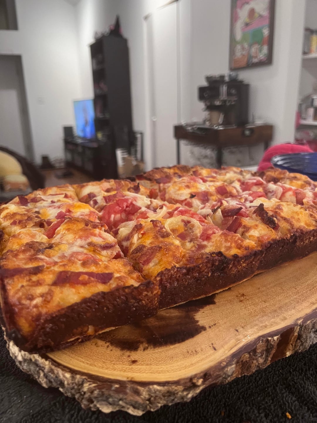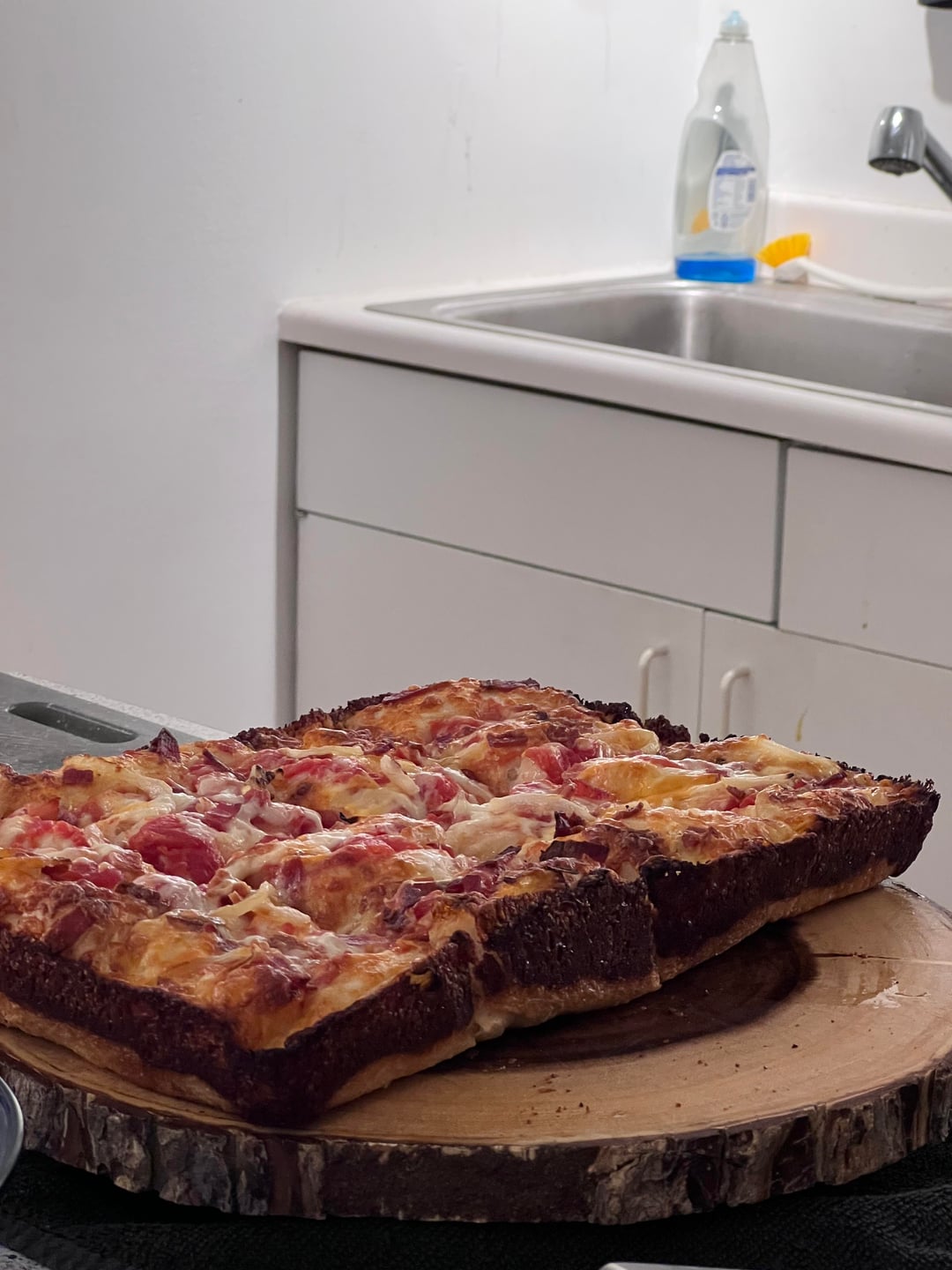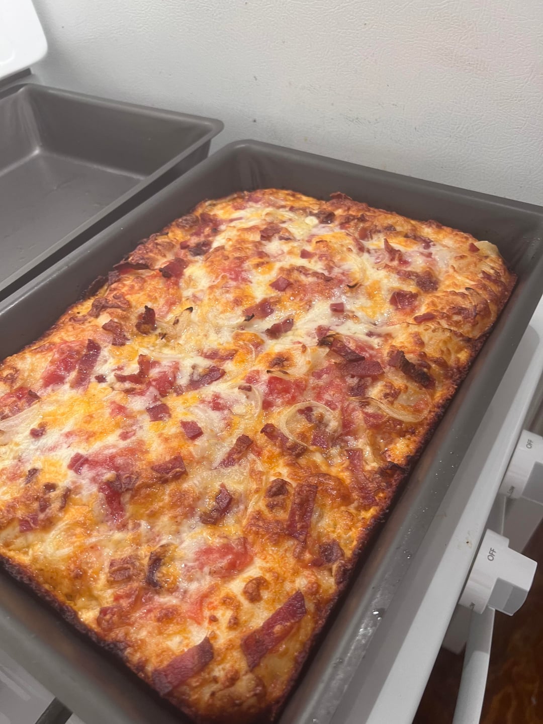 cooked in lloyds alternative 13×10 detroit pans. mainly brick cheese, but also cheddar + some bacon and onion. light on sauce cause i like to put cold red sauce on top when i eat it. super light and airy dough. cold fermented for about a day. my recipe is based on a couple different sources but ultimately my own take i can put the recipe in the comments if someone wants.
