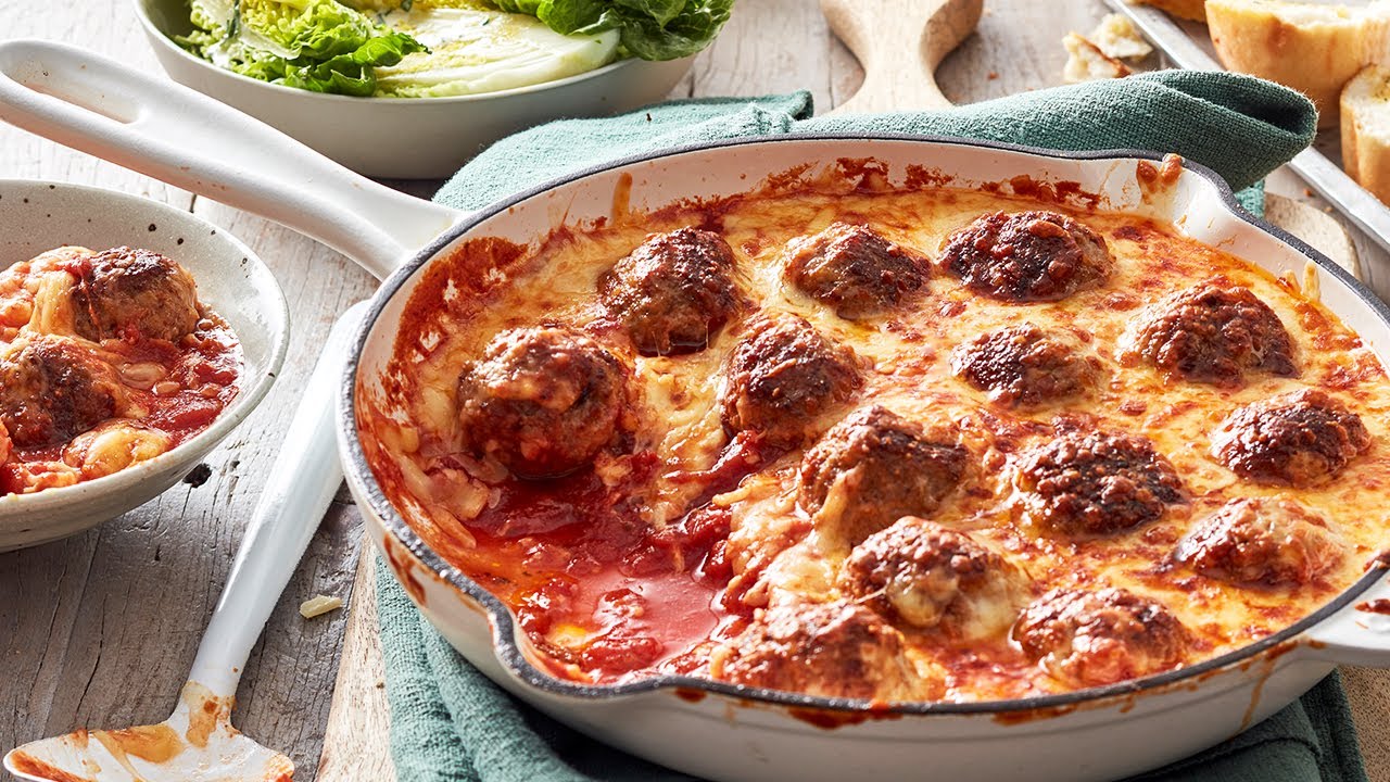 Learn how to make an easy Italian-style meatball recipe, then top with a flavour packed cheese blend to turn it into a saucy, one pan meatball parmigiana. These meatballs can be frozen before cooking too so worth making a double batch to keep weeknight dinners easy. Meatball recipes with tomato sauce and cheese, baked in the oven are an easy family meal. Serve this meatball parmigiana with garlic bread and a side salad.