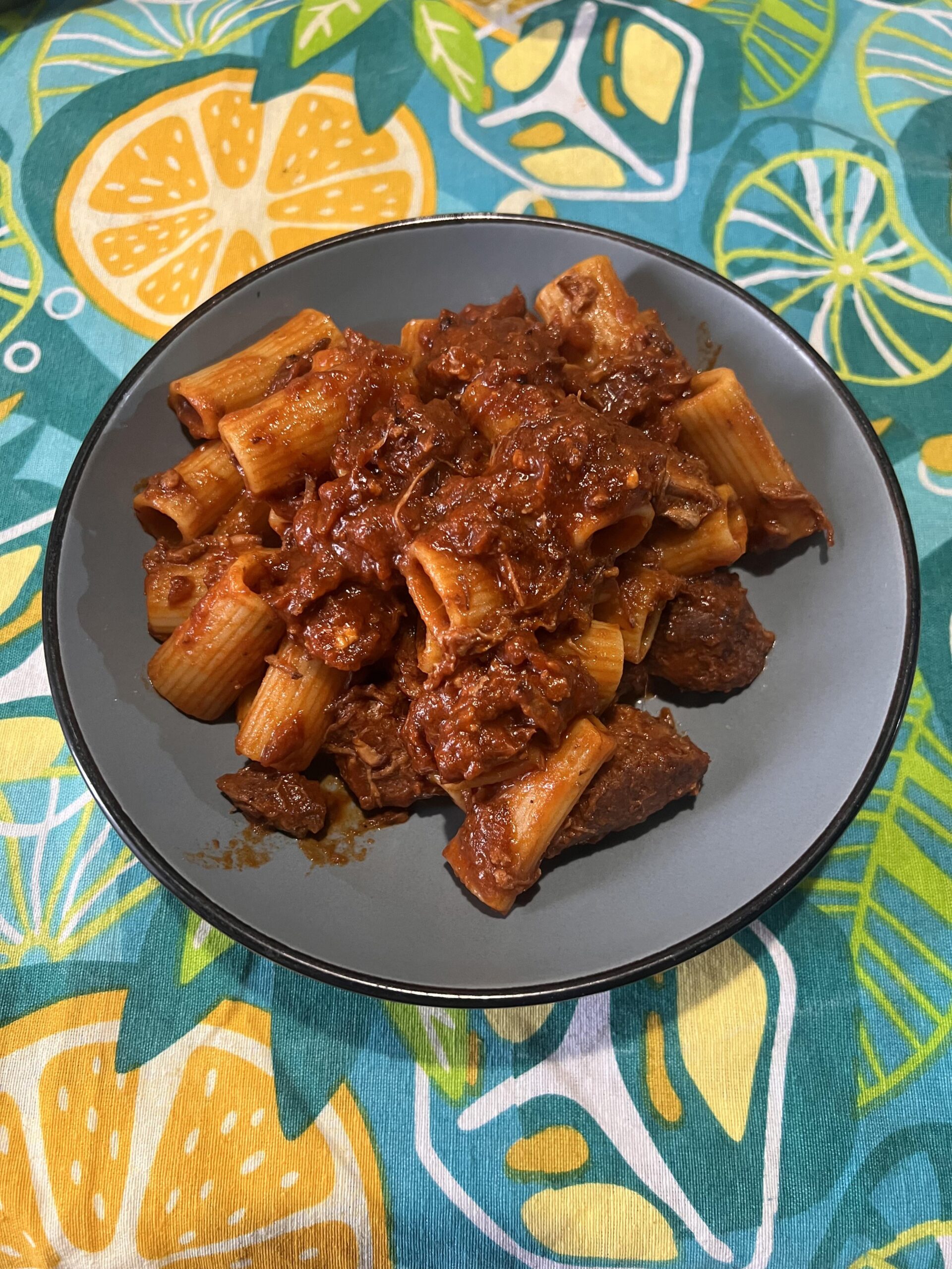 Recipe: Buy some sausages, pork ribes and viel Fry them in a large pot with some olive oil (not to much cause of the grease of the pork meat), when the meat turn brown put it in a plate and after add finely chopped onion, celery and carrot, after 3 minutes add again the meat and after put two glasses of red win, be calm you will not get drunk because the alcool will evaporate, after that add almost a bottle of tomato sauce and a pinch of tomato paste, when it starts boiling add a little secret, a piece of dark chocolate, it will give a nice flavour to the sauce, add salt just as your taste, after that you just have to wait, more you wait more you will be delighted, i suggest you 5/6 hours. Passed these hours cook the pasta add the sauce and enjoy the meal.