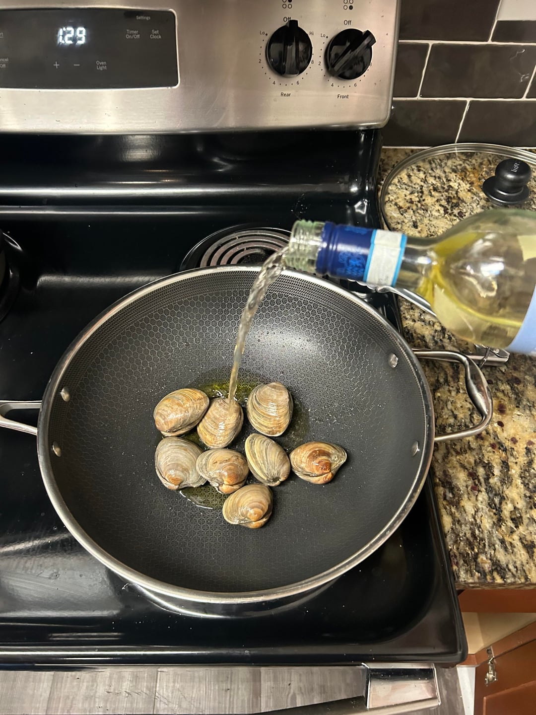 Cover with lid and wait until clams pop open. Shake the pan a bit in-between