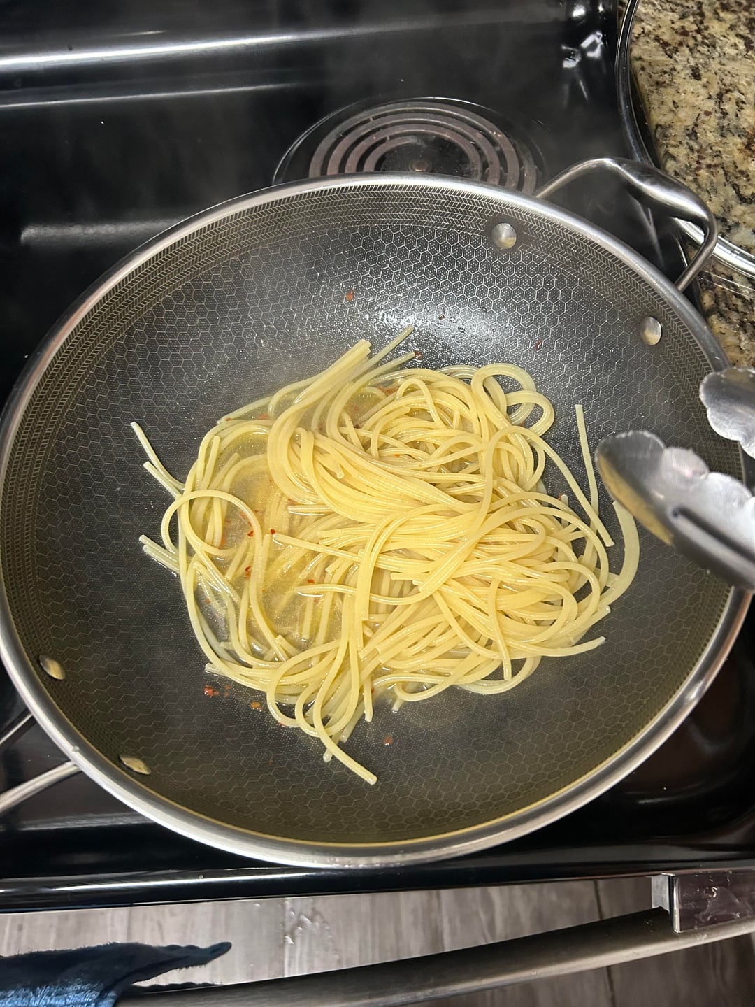 Ingredients: spaghetti, fresh clams, garlic, extra virgin olive oil, parsley, pepper flakes, white wine, salt