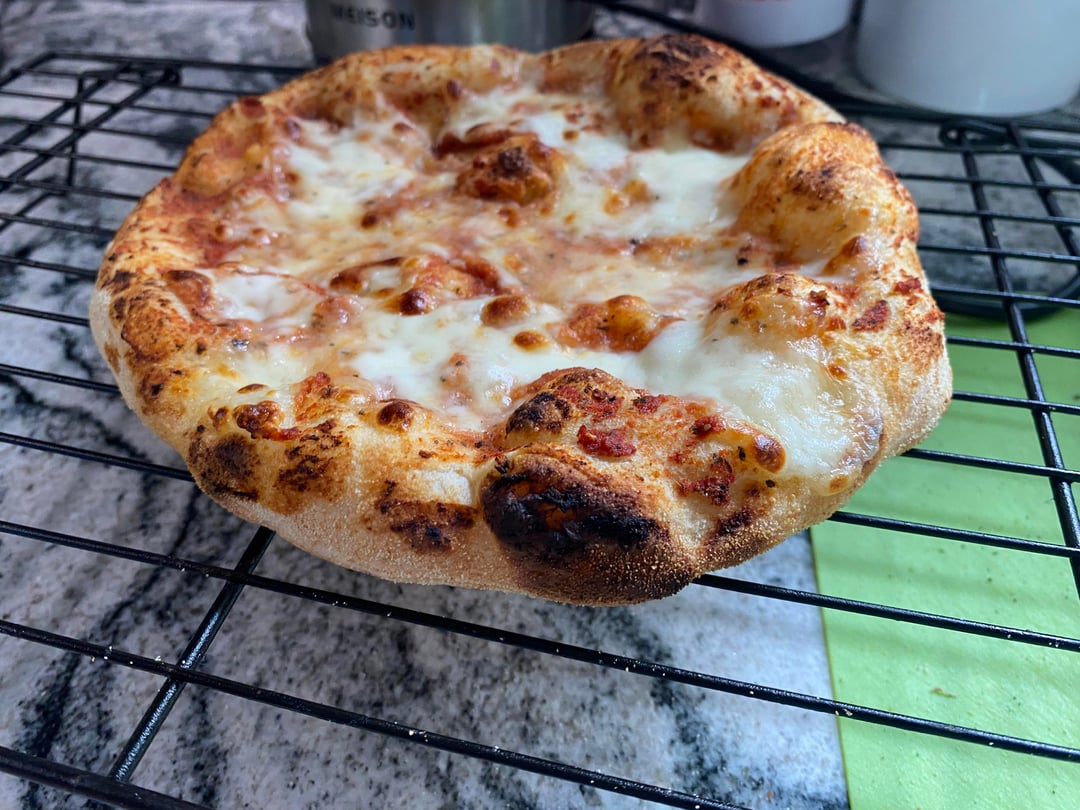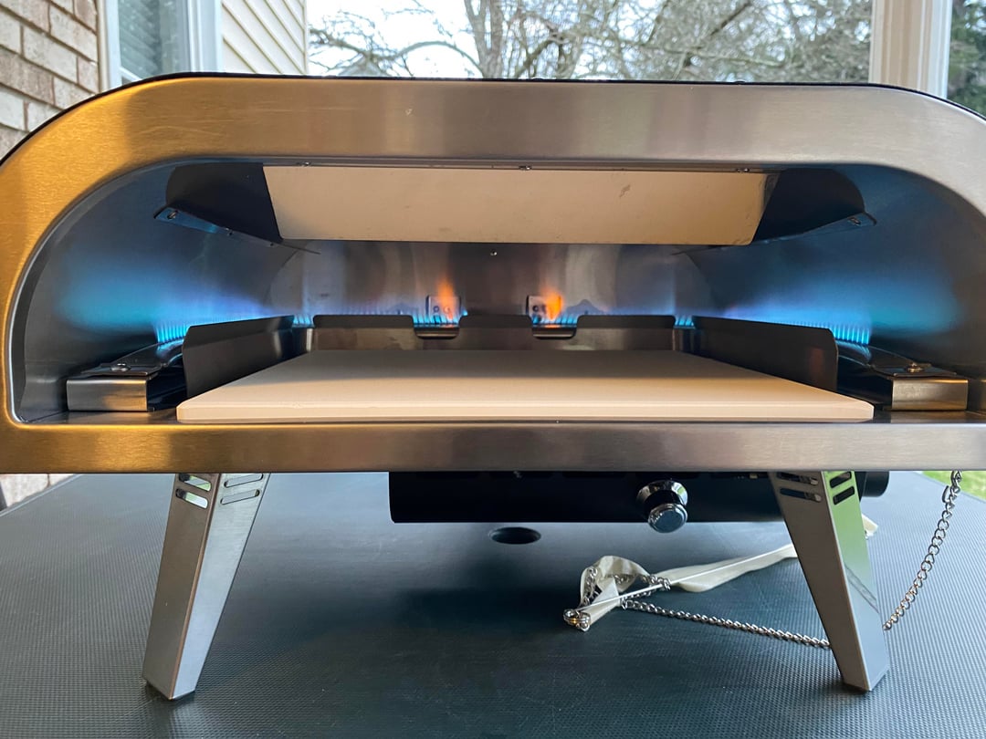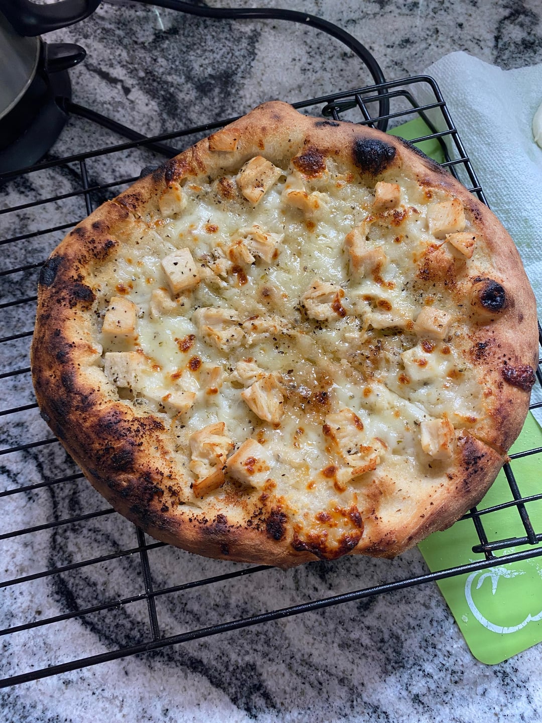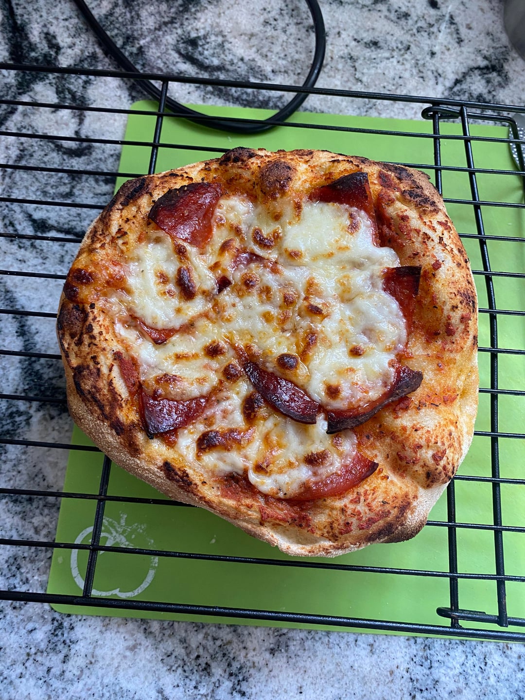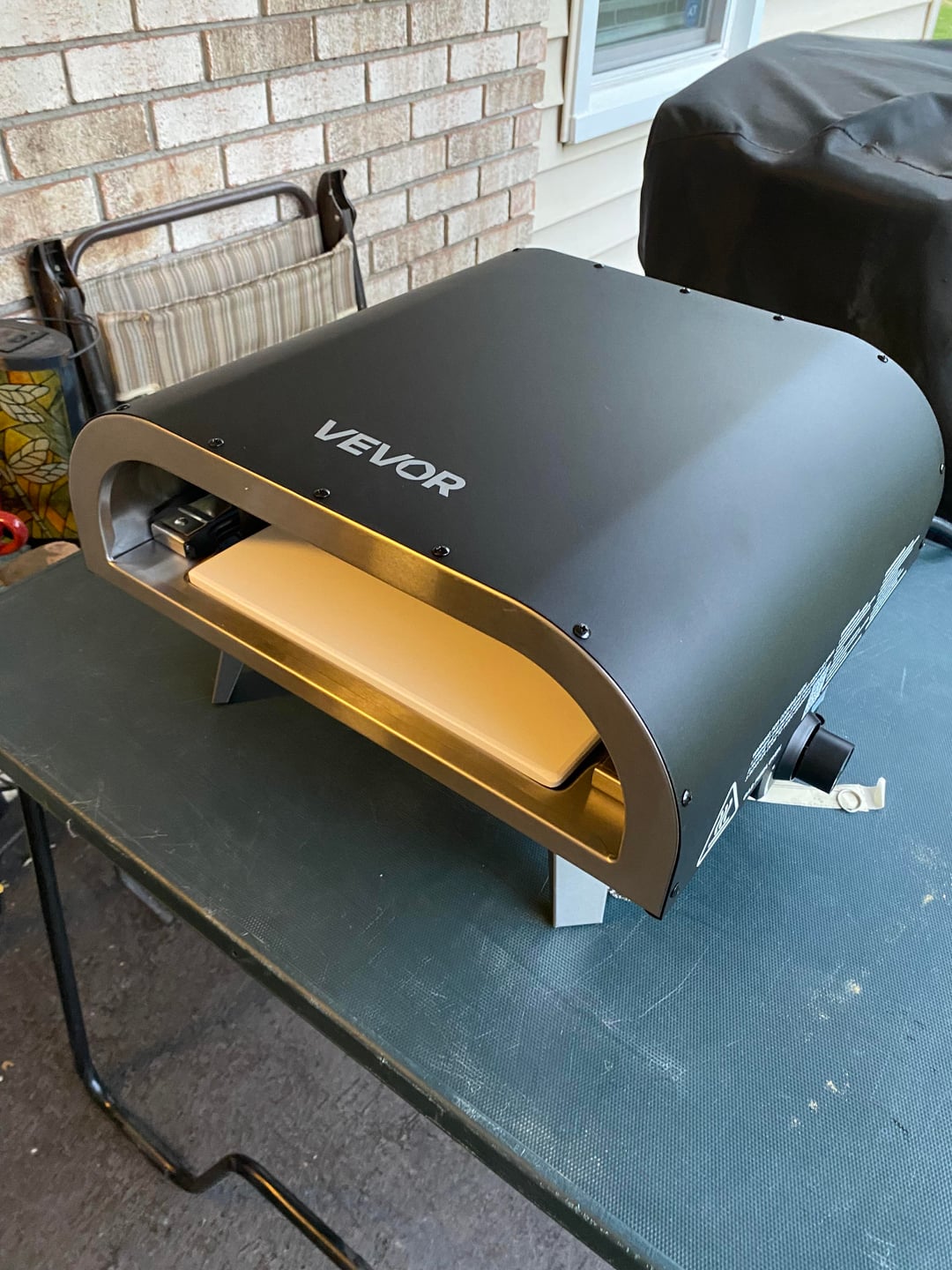 Vevor 12” gas pizza oven. This was ( and currently still is ) $120 on Amazon. I’ve used a koda 12 and a Breeo wood fired oven in the past so this isn’t my first time, BUT this is my first time using this particular oven. It is super well built. The walls of this are thick and well Insulated. It is considerably heavier than the Ooni. The flame control is actually pretty decent. It is variable but it pretty much has spots where it is high, medium, and low. At no point did I have to completely kill the flame like I sometimes do in the Ooni which was nice and also surprising. It gets plenty hot with the horseshoe burner and the heat deflectors do a good job of sending the heat right down onto the stone. My stone temp at launch ranged between 725F and 775F after about a 15 minute preheat. Recovery time between pizzas was about 5 minutes. Just enough time to get another pizza ready so it’s perfect. I found using room temp-toppings compared to refrigerator temp toppings didn’t make much of a difference . The thing that did make a difference was the temp of the sauce. Cold sauce did not allow the bottom to crisp up before the top was done . After letting the sauce come to room temp, all was good. If you zoom on the pic of the undercarriage, you can see it did get some color. It was crispy however so I wasn’t too concerned that it wasn’t brown. I did find it strange it didn’t get more brown, however that may be because of my recipe which is below this . Feel free to ask any questions. I’m not glued to my phone so it may not be instant but I’d be glad to answer .