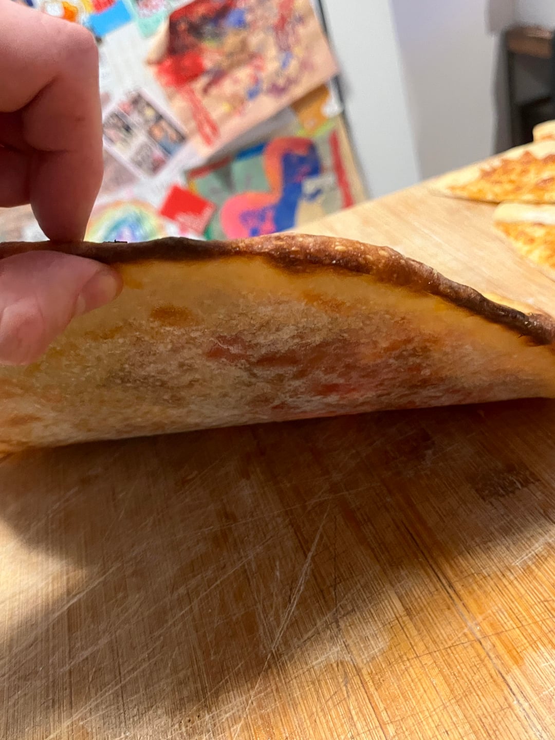 Baked on a preheated inverted baking sheet at 425 in a home oven, approx. 15 mins