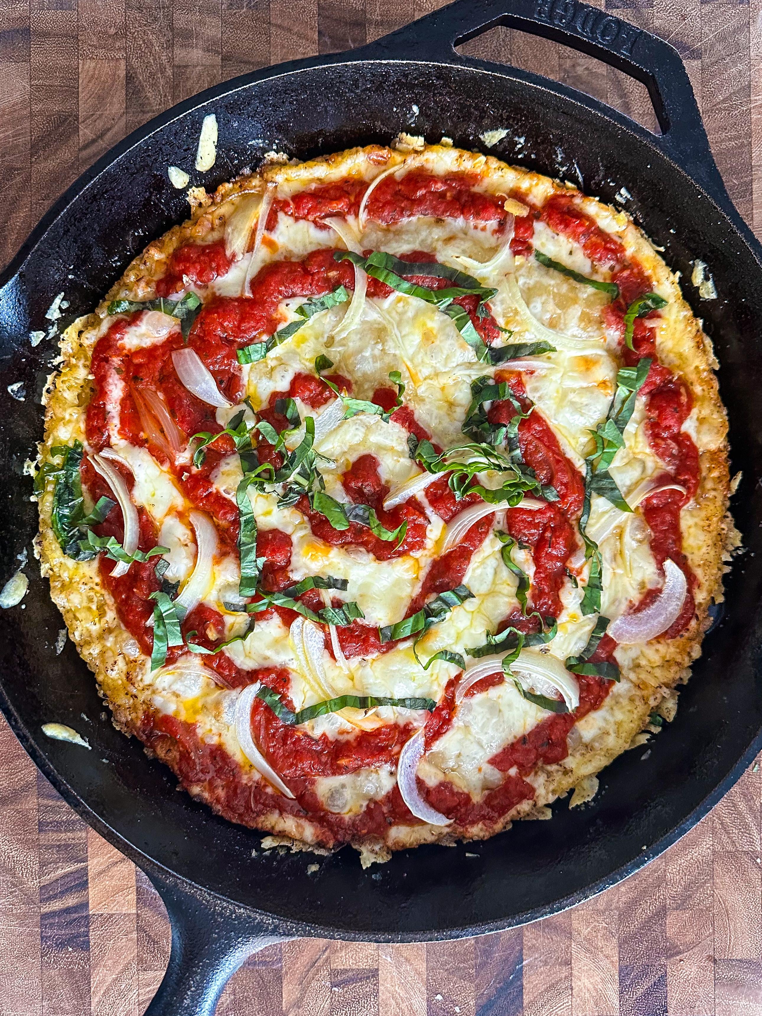 I built the frico with a mix of part-skim mozz and monterey jack, then covered the rest of the dough with part skim mozz. I spooned the sauce on top of the cheese and scattered some thinly sliced onions over the whole thing. Into the oven at 500F for 15-16 minutes. When I pulled it out, I immediately added thinly sliced basil (the residual heat form the pizza cooked the basil perfectly) and parm. The bottom was a bit lighter than I prefer, so I put the skillet on the burner over medium-high heat for another 2-3 minutes. I let it cool on a wire rack for a bit, then crushed it.