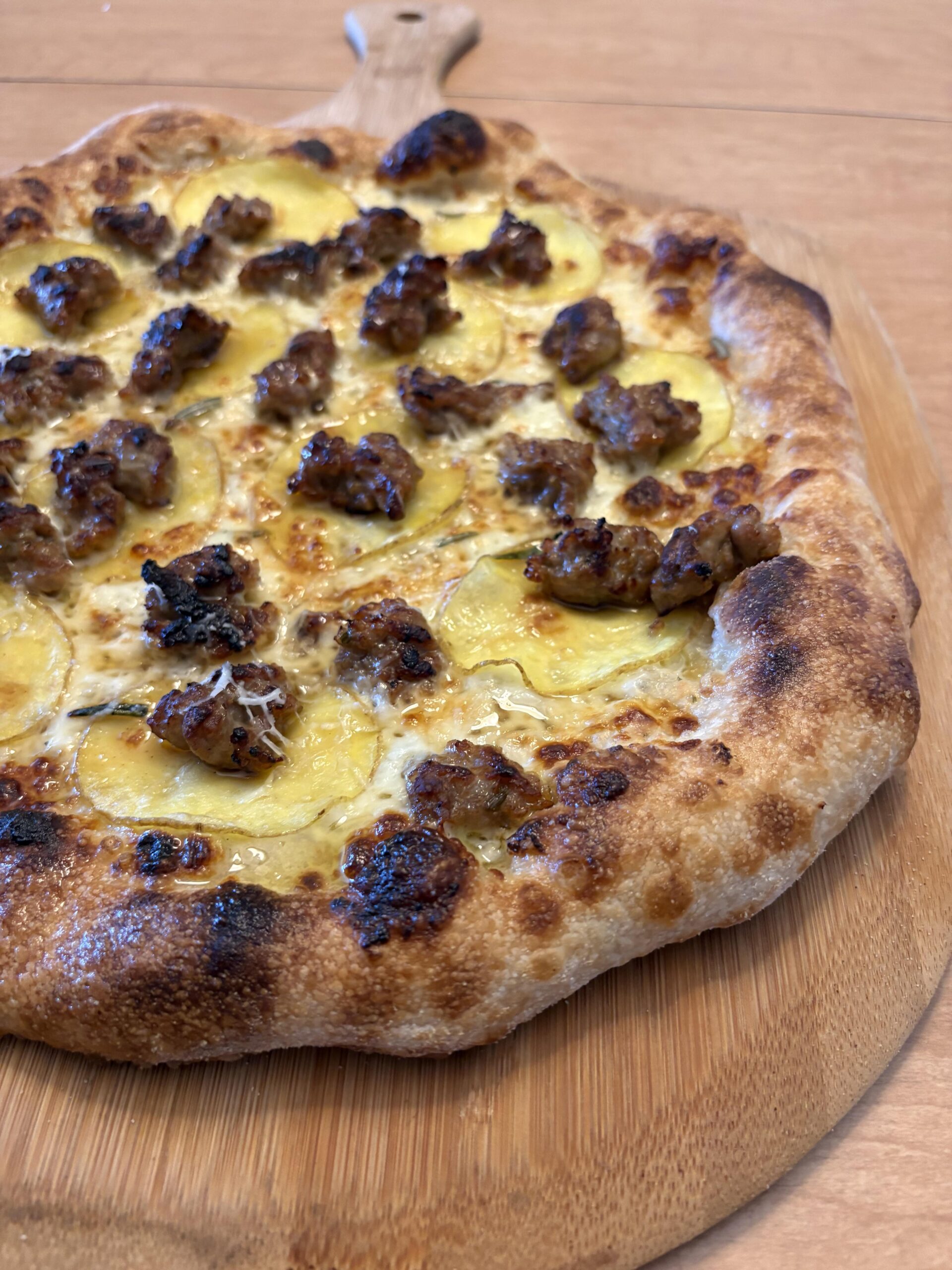 Garlic herb cream sauce base, mozzarella and cheddar, thin sliced potatoes, Italian sausage, rosemary. Post-bake topped with pecorino romano and hot honey. 72 hour fermented dough, cooked on a baking steel preheated for an hour at 550 degrees; 4 minute broil on high, 2 1/2 minute bake.