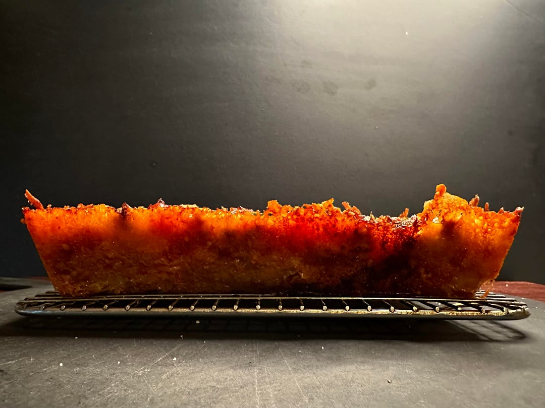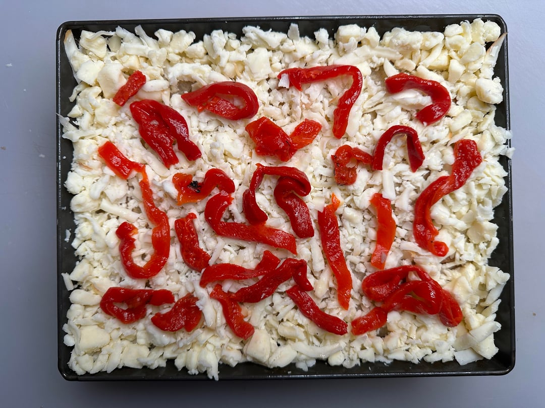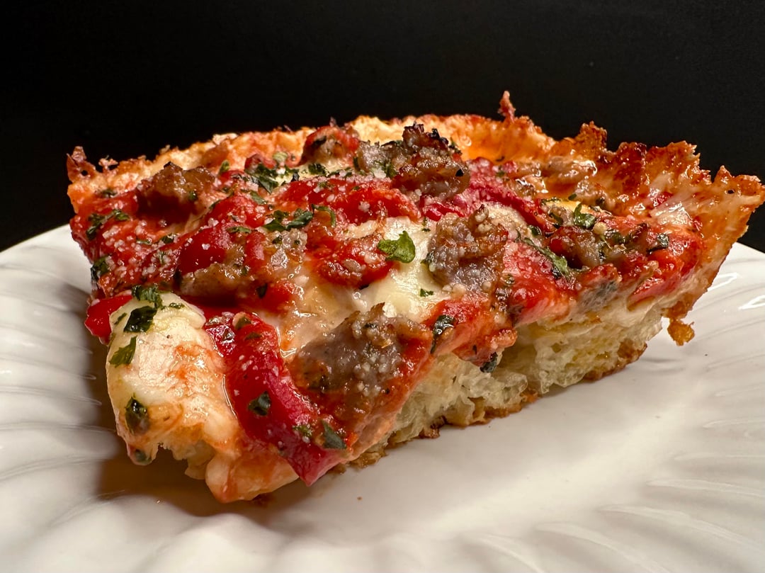 Pizza night! This week’s special was a Detroit style sausage and peppers. I used my three-cheese mix (mozzarella, provolone, and smoked Scamorza), plus some Monterey Jack and cheddar around the edges, roasted red peppers, homemade sweet Italian sausage, red sauce, and grated Pecorino Romano. Finished with some light,y dried Italian herbs and more Pecorino.