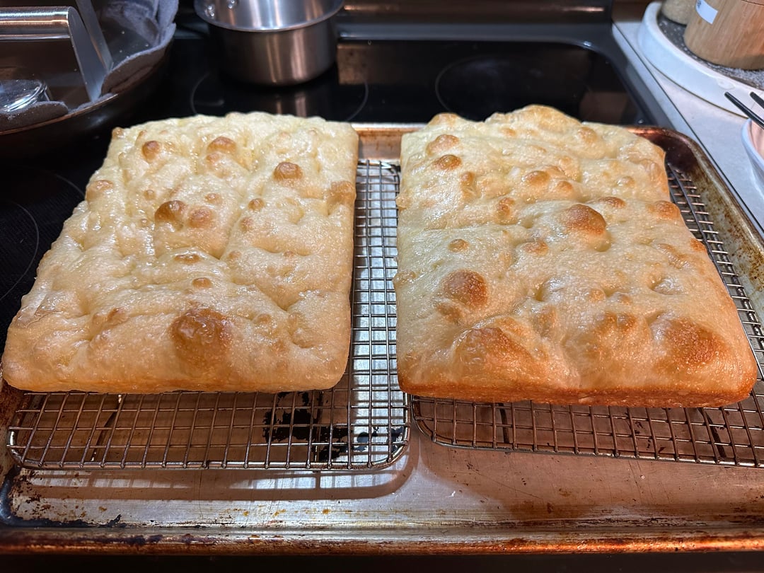 Crust was a par baked 48 hour 85% hydration focaccia dough made with King Arthur high gluten flour.