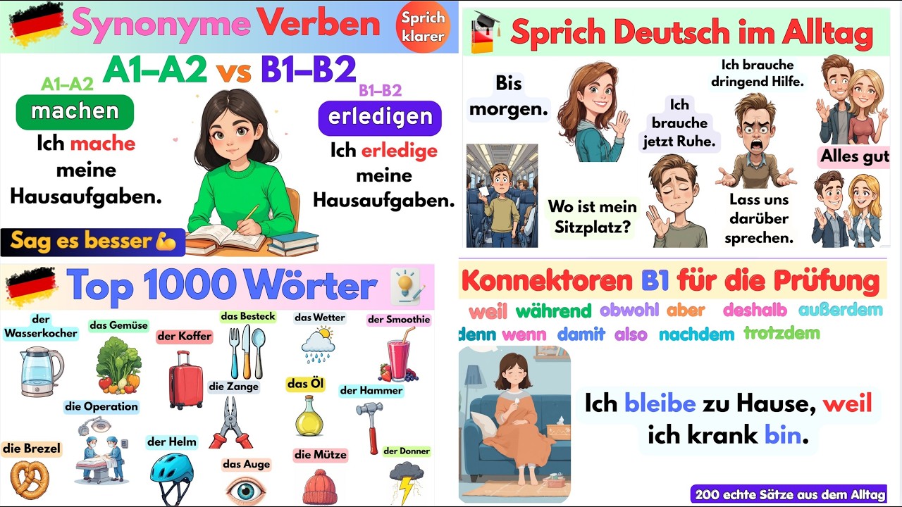 In diesem Video lernst du Deutsch von A1 bis B2 mit wichtigen Wรถrtern, Verben im Vergleich (A1โA2 vs B1โB2), Konnektoren fรผr die Prรผfung und echten Alltagssรคtzen. Perfekt fรผr Anfรคnger und alle, die ihr Deutsch schnell verbessern mรถchten.