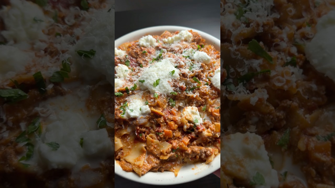 1. Je pense que si tu prend une poêle, que tu y met un filet d'huile d'olive, avec un oignon, une carotte, du concentré de tomate, que tu fait revenir de la viande haché avec du basilic séché et du piment d'Espelette, que tu casse des lasagnes, que tu met de l'eau a hauteur et que t'ajoute de la ricotta, que tu dresse une belle assiette avec une grosse buratta et bah sa reste des lasagnes