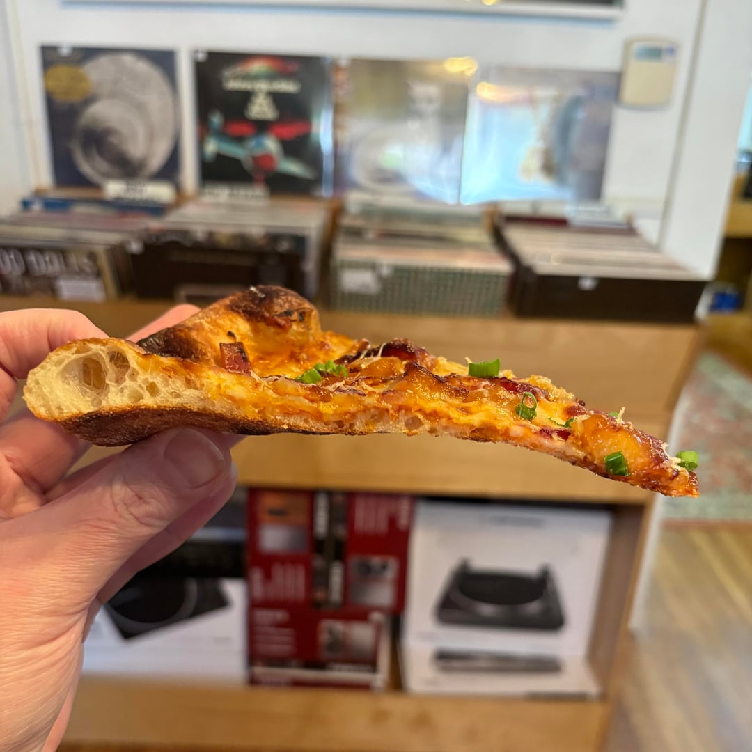 Red sauce layered with Jwala green chilies, mozzarella, provolone, sautéed sweet onions, bacon, pineapple, red onions. Finished with pecorino romano, scallions, and hot honey. Baked in home oven on a baking steel preheated at 550 degrees for an hour. Broiled 5 minutes on low, then turned to bake for last 2 1/2 minutes. Dough is made with 24 hour poolish, then dough balls fermented for another 72 hours.