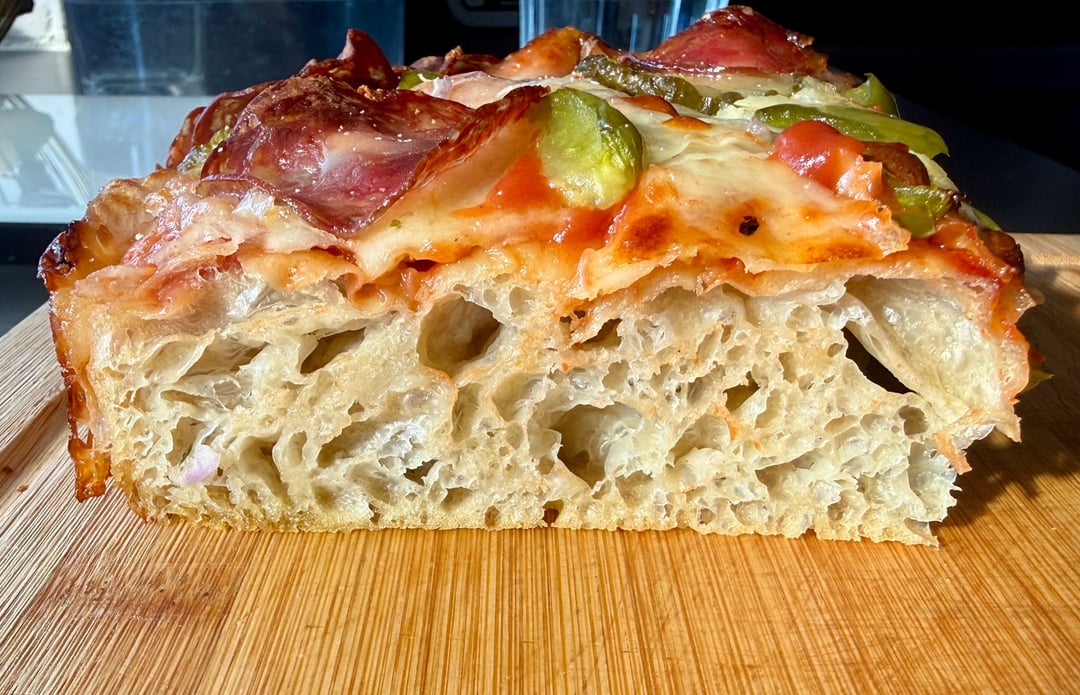 This is my second attempt at a Sicilian style pan pizza. The first one was good, but the bread wasn't airy enough. Learned from my mistakes and the second attempt turned out much better.