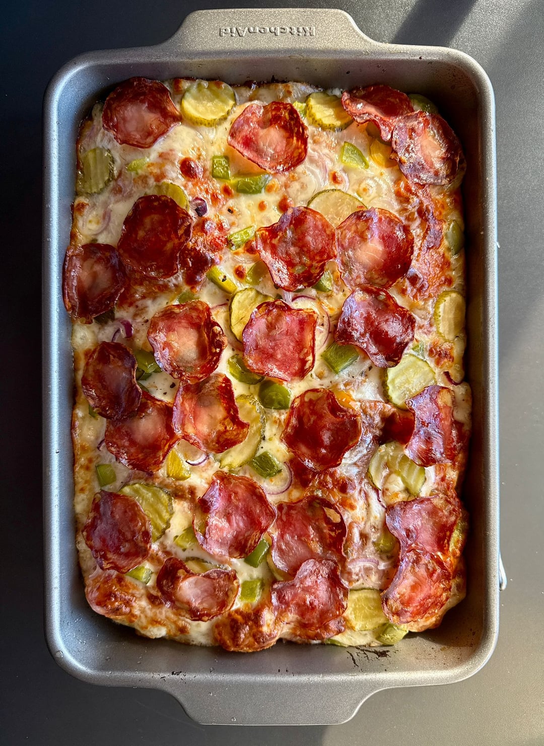 For the toppings i really wanted a rustic farm flavor – mozzarella, tomato sauce, Salami Milano, pan roasted green peppers, red onions, sweet marinade pickles, oregano and some garlic powder. Loosely inspired by farmers pizza from Ikea with similar ingredients. Added some extra cheese for the crust on the sides.