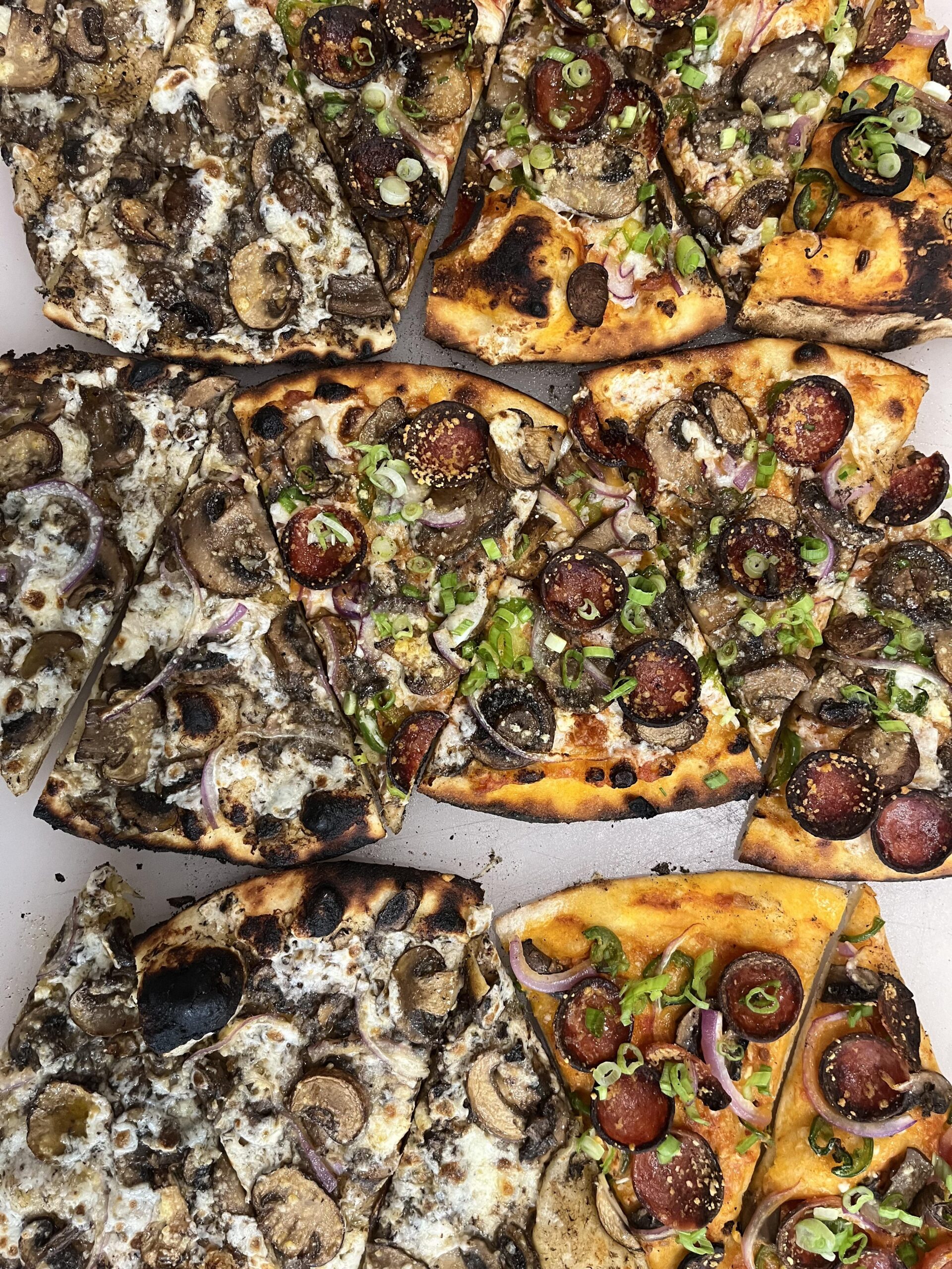 On the right we have a parmesan cream sauce with Ezzo pep, red and green onions, jalapeño, and sautéed mushrooms.