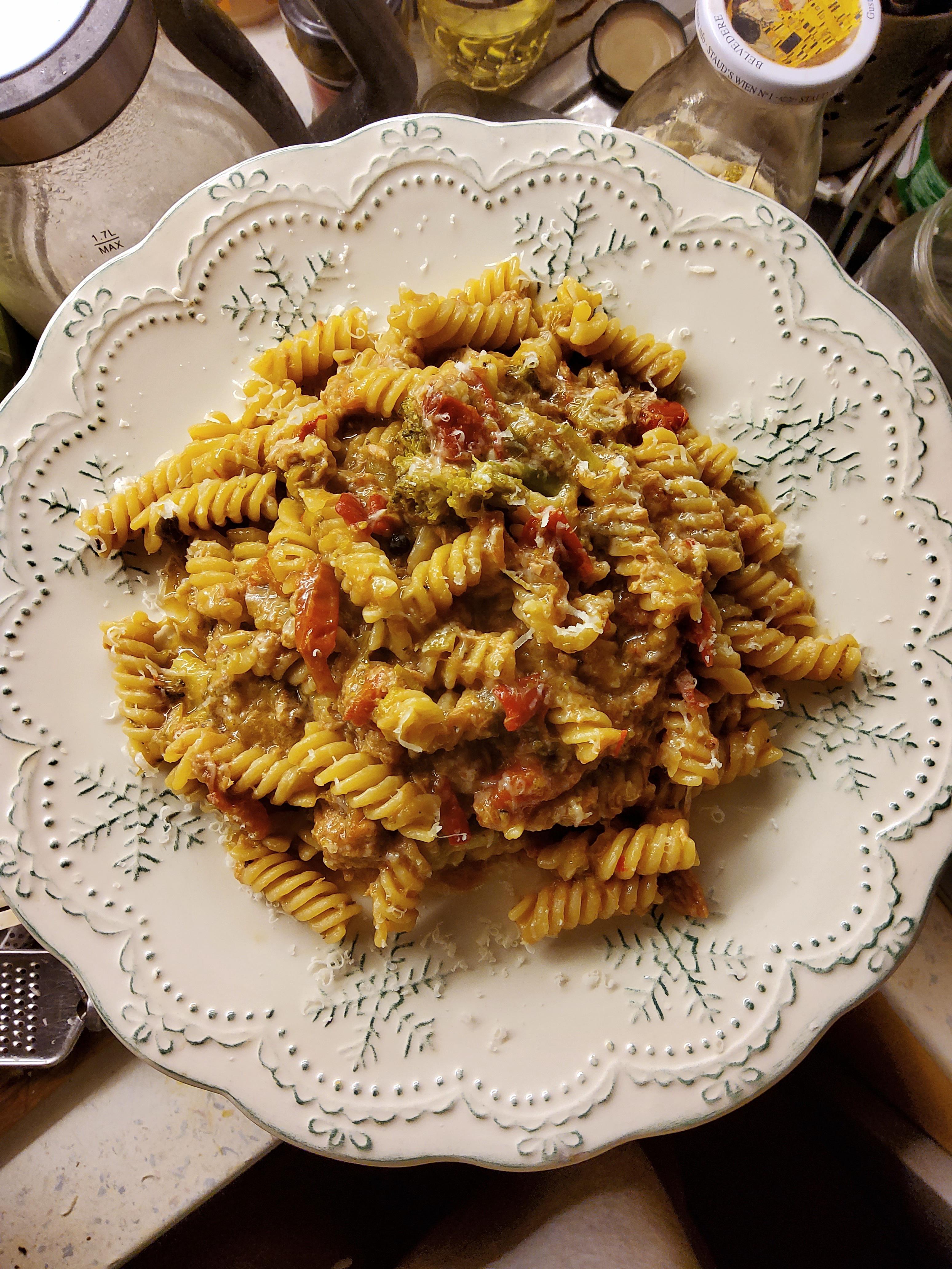 Pan/pot -> olive oil -> sliced garlic -> salsiccia meat -> chilli flakes -> melt the salted anchovie fillets -> deglaze with white wine -> let it evaporate -> add boiling water -> add broccoli and the pasta -> add salt -> cook risottato style -> when the pasta is al dente and the broccoli florets are still crunchy take off the heat -> toss to obtain a very creamy sauce -> season with cracked black pepper -> a drizzle of lemon juice -> sprinkle with hard grated cheese (optional)