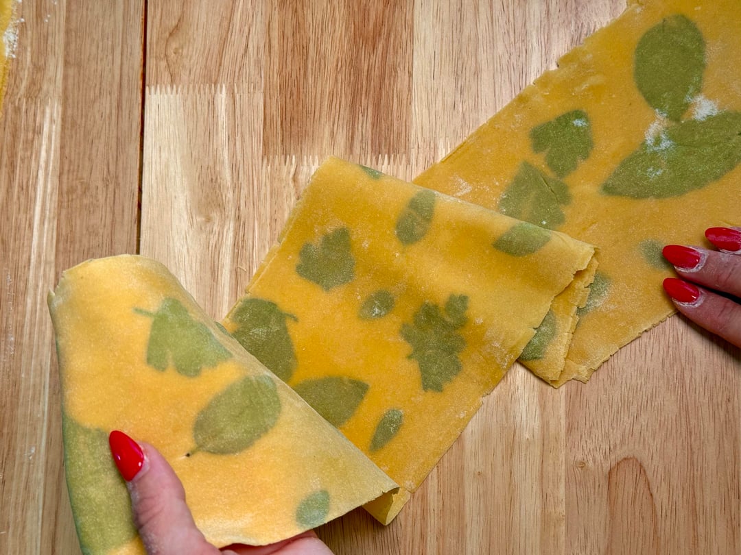 The dough is herb-laminated with basil, parsley, and oregano, creating a cool, almost fabric-like, pattern.