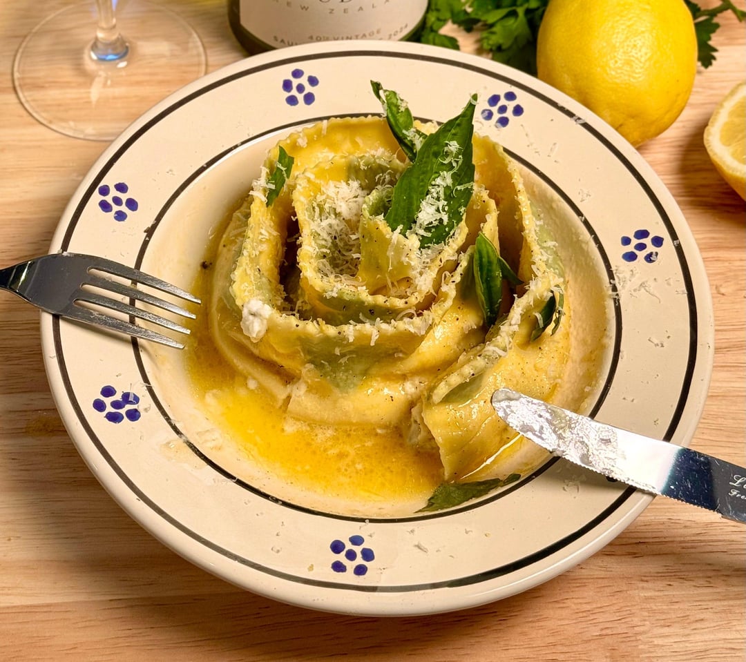 Pappardelle ripiene (somewhere between pappardelle and ravioli), filled with ricotta, lemon zest, Parmigiano, and a pinch of nutmeg, then coiled into a spiral.