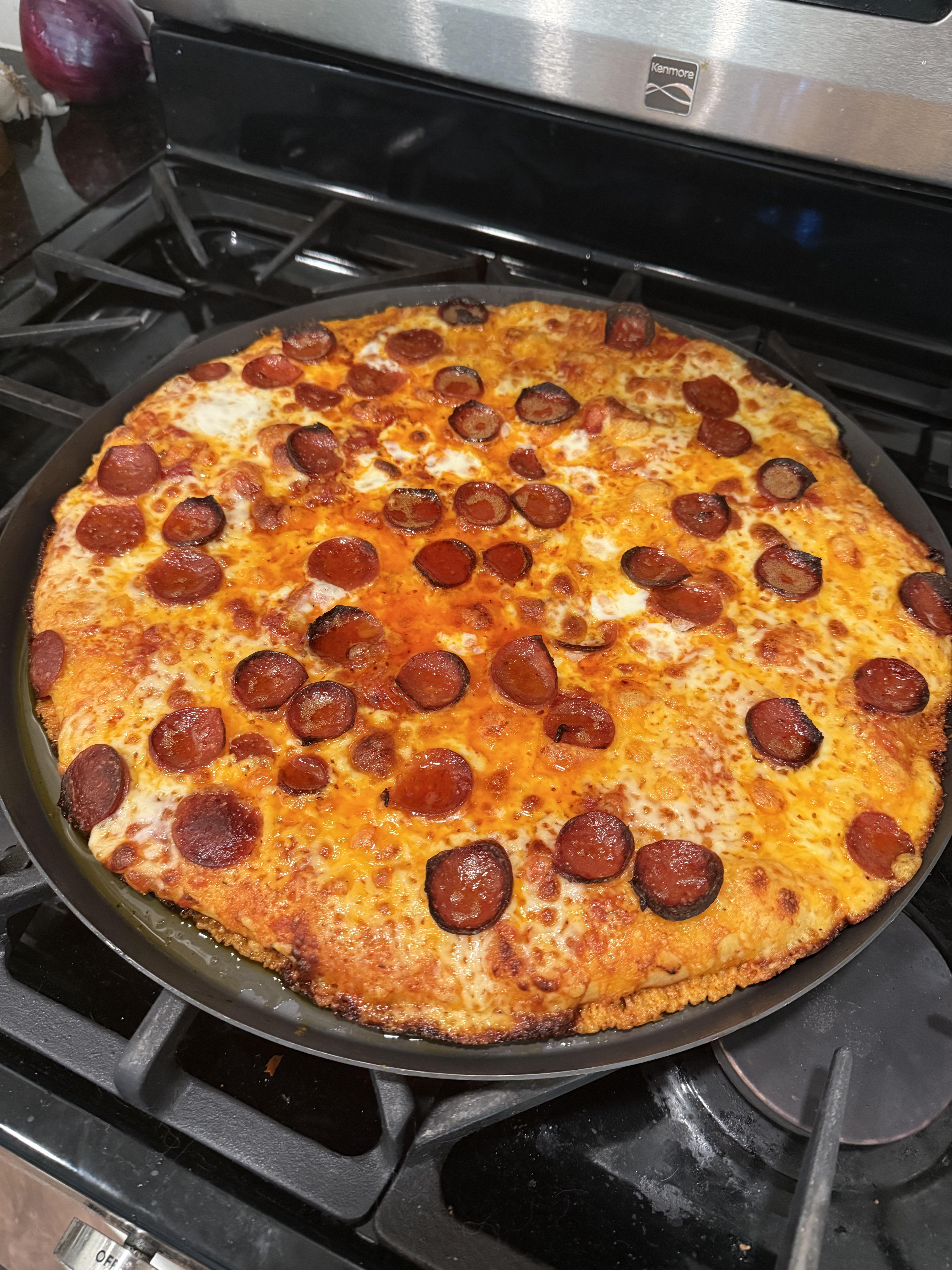 550 Deg builder grade oven. 16” Lloyd’s pan. Would put it down one rack in the oven next time to crisp the bottom more. Came out a bit too thick.by mcbeermaster NORMAL OVENpizzaWrite A CommentYou must be logged in to post a comment.