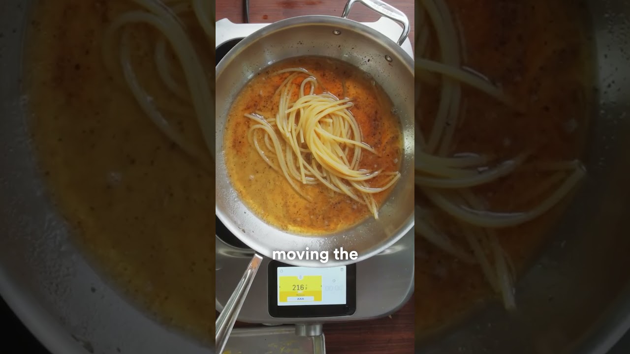 Working quickly, transfer 240 ml pasta water to pan with fat, and bring mixture to boil on high heat, swirling constantly. Add spaghettoni to pan, cook 3 to 4 mins, add more pasta water as needed. Toss is remaining fat, remove from heat.