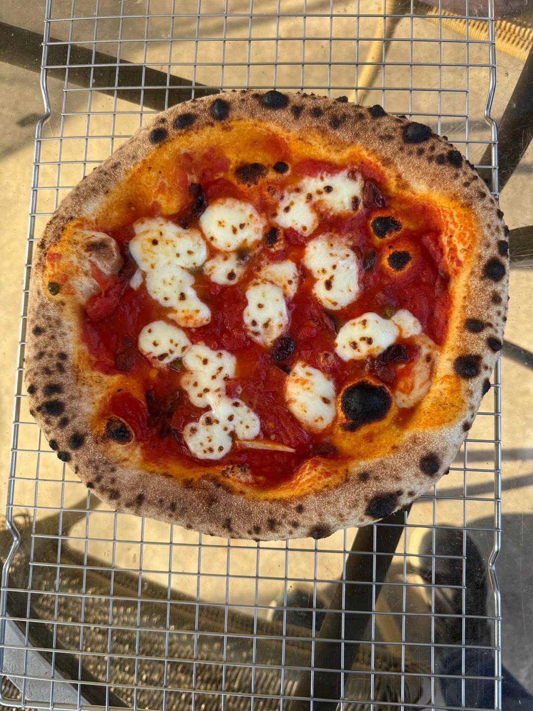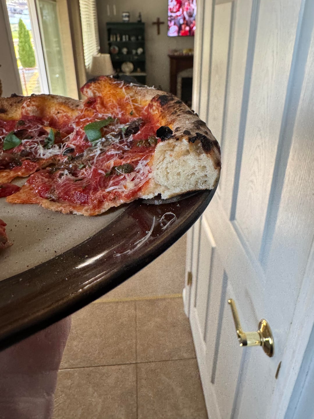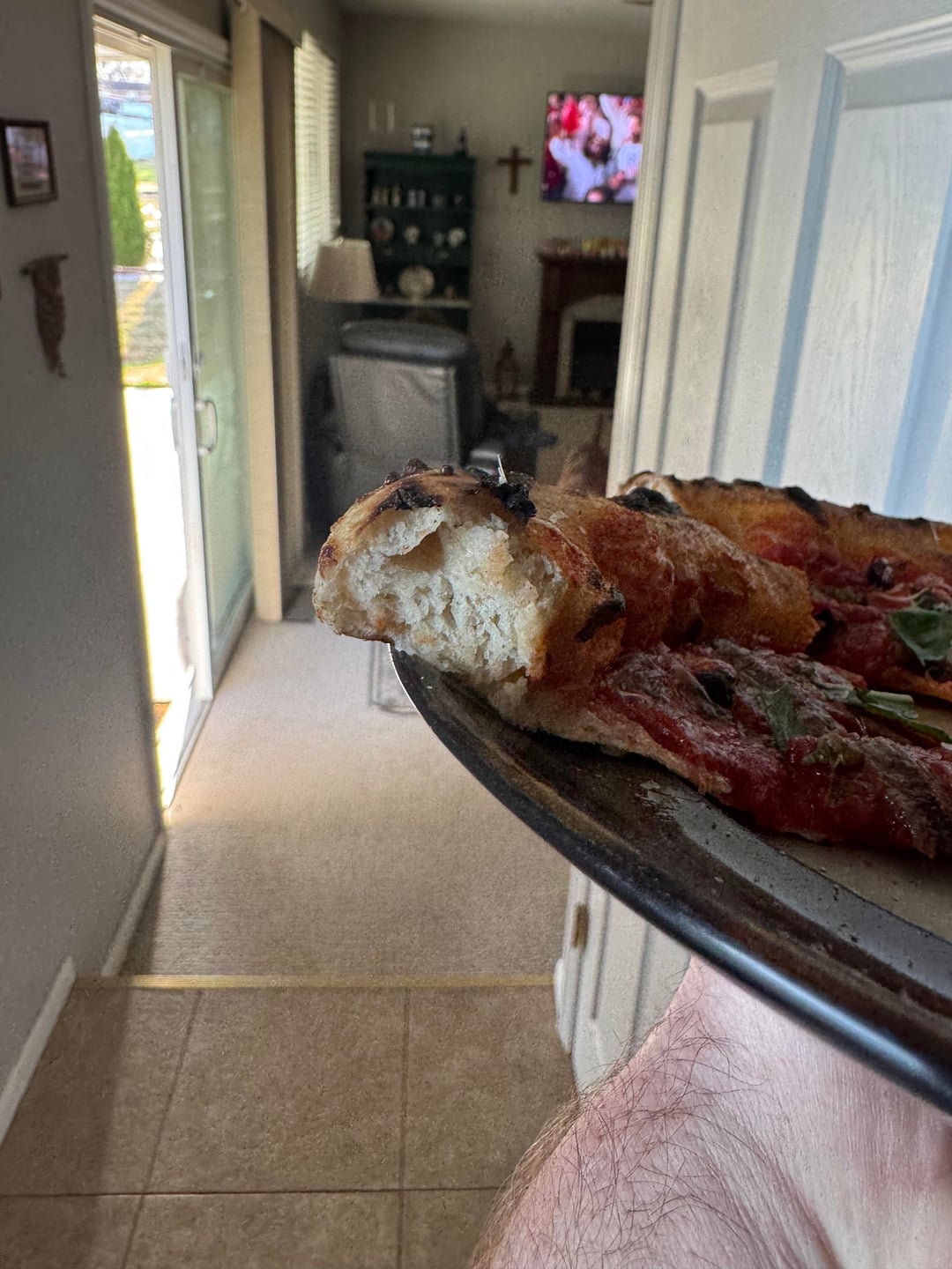 Pizza crust has come out too dense and bready my last couple bakes. This was a 6% WW, 95% 00 two day cold ferment. 62% hydration. Dough handled nicely and felt like my timing was good. I’m tempted to up the hydration but I see some people post incredible airy doughs with around 62% so I thought it was a skill issue. Kneaded by hand til light shined through it, balled, and put into fridge. Used a chart from Tom Lehman for the yeast amount. If I had to guess I’d maybe say if anything a touch under fermented but it was fairly on I think.