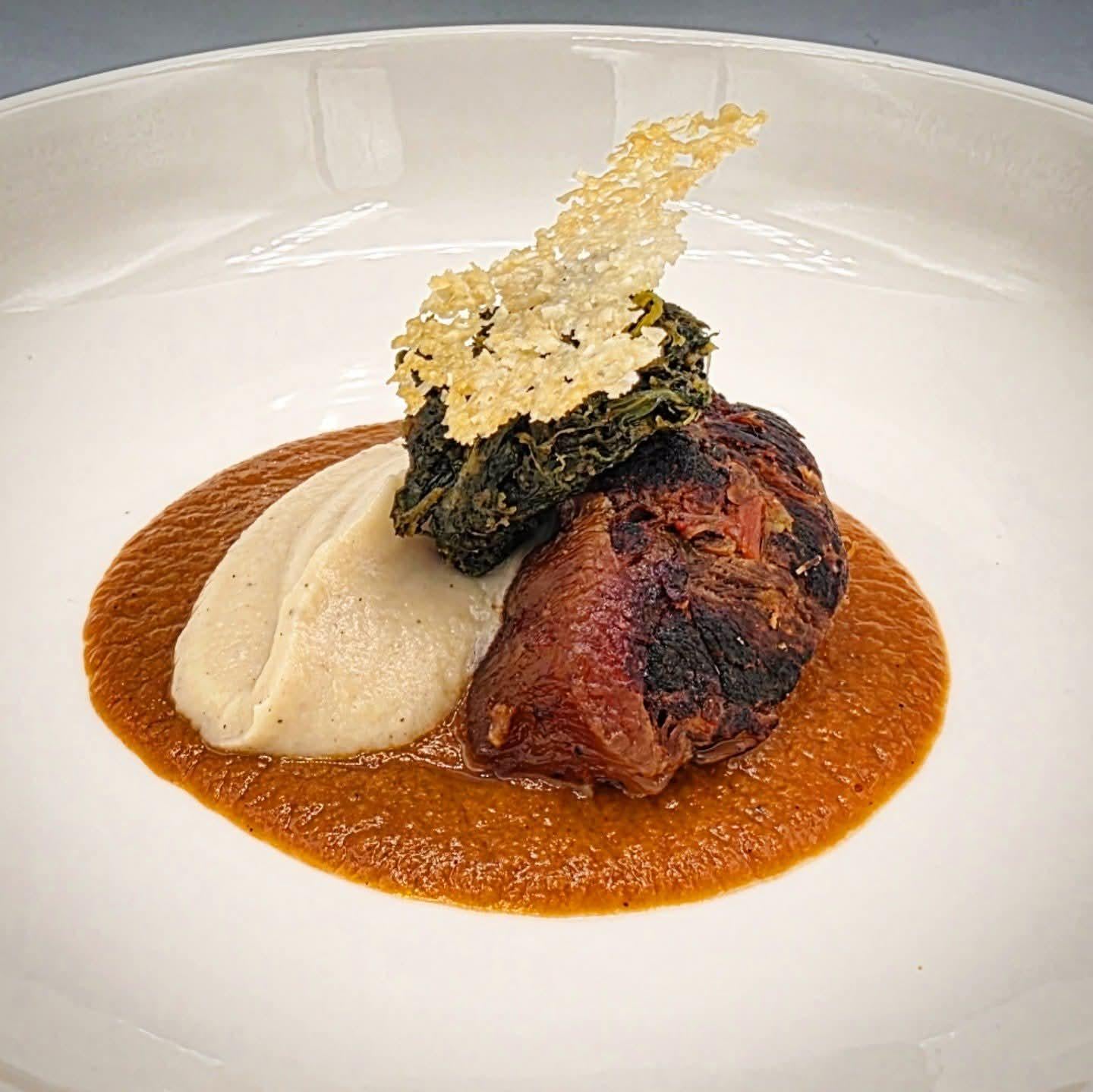 Jorinji onion koji marinated beef shank braised in Guinness and San Marzano tomatoes, bone marrow ragu, roasted cauliflower and white onion purée, spinach gratin, Parmigiano Reggiano tuile