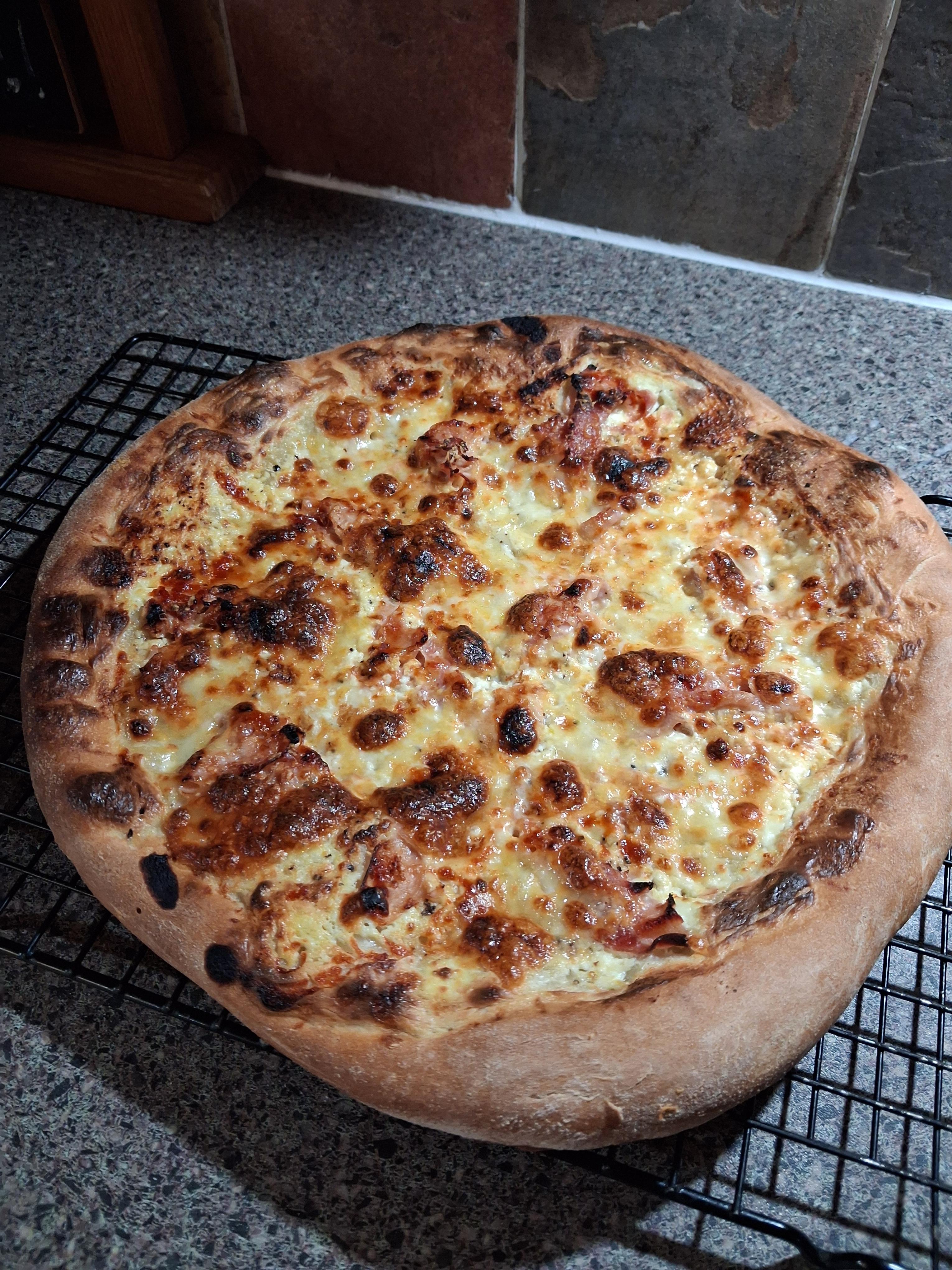 330g Strong White Bread Flour220 water4g dried yeast6g saltCreme Fraiche base with mozzarella & ham Better result than I thought with less than 2 hours to make dough, rest and cook!by GrowleryKing NORMAL OVENpizza 1 Comment kami_sama16 3 days ago So you made the dough and went to the bar? Came back from the bar and waited 2 hours?Write A CommentYou must be logged in to post a comment.