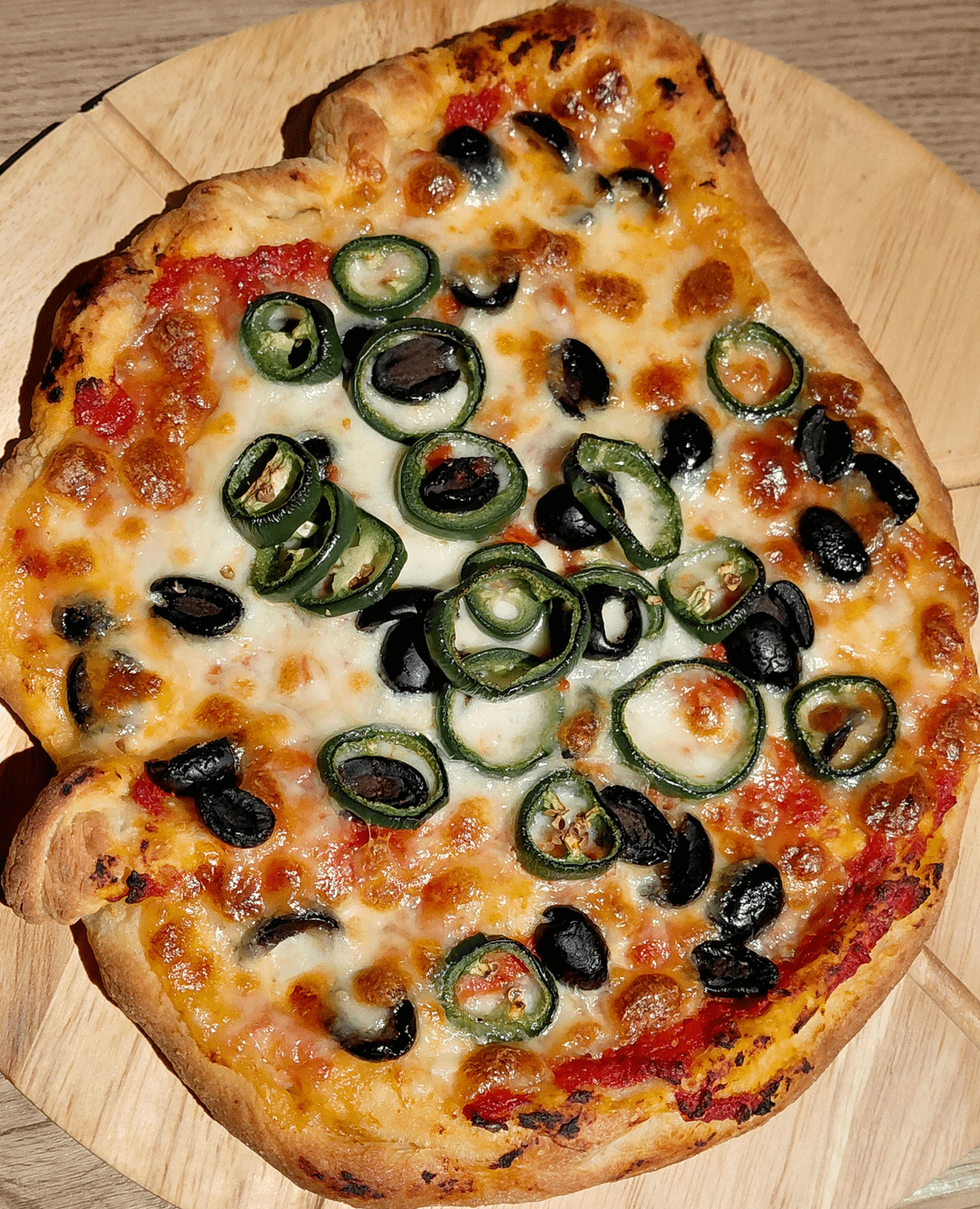 I cant remember where this recipe started: water 360ml, sugar 12g, yeast 9g, olive oil 30ml, salt 18g, flour 600g, 24hr cold ferment, mozzarella olives and jalapeños. the base was quite thin and held up well but underneath was undercooked, I know not having a steel isn't helping with this. The crust was quite poor/non existent. This made 4 dough balls, 2 pizzas came out the same as the pics, the last 2 balls I refrigerated for 72 hours but they barely rose at all. Anyway still learning.