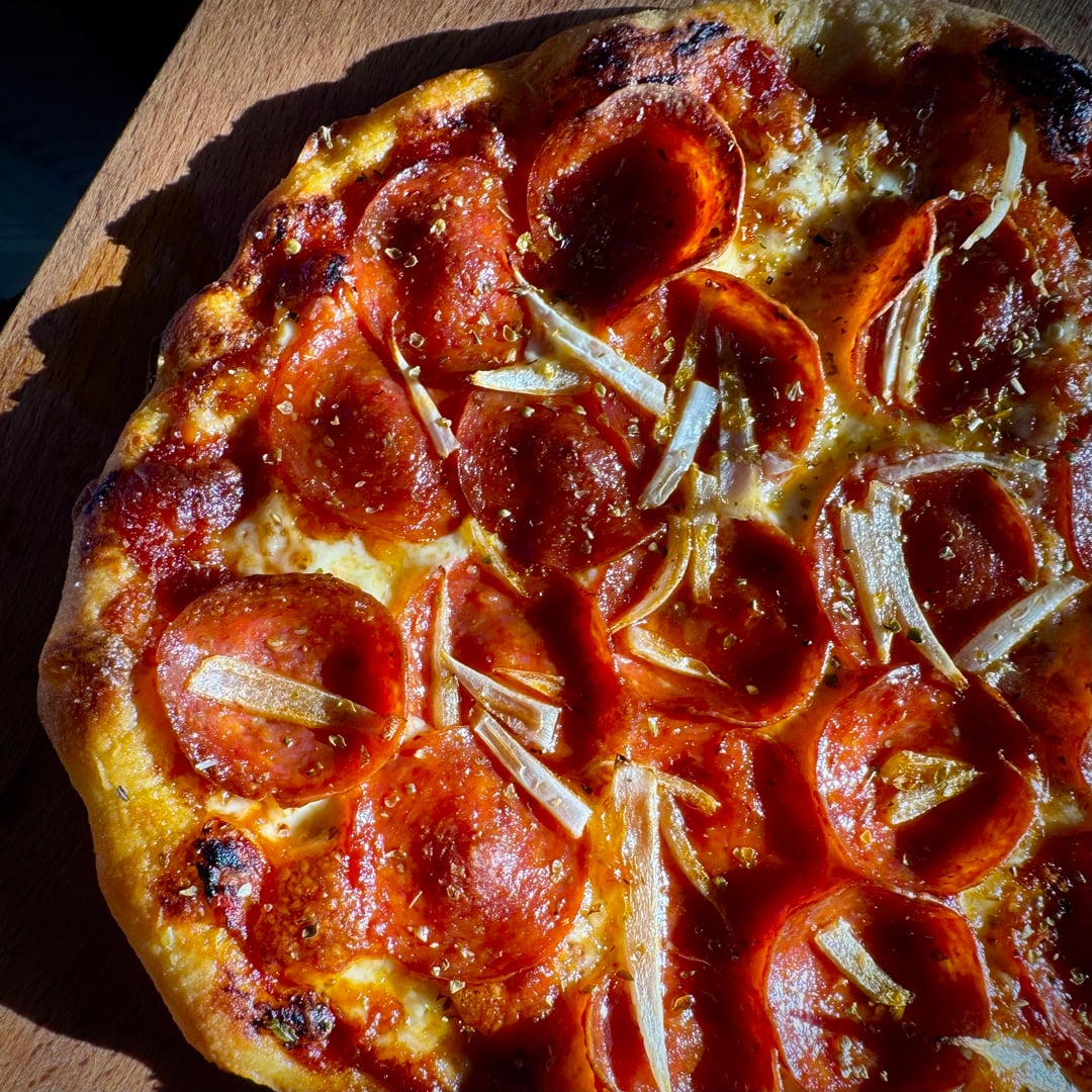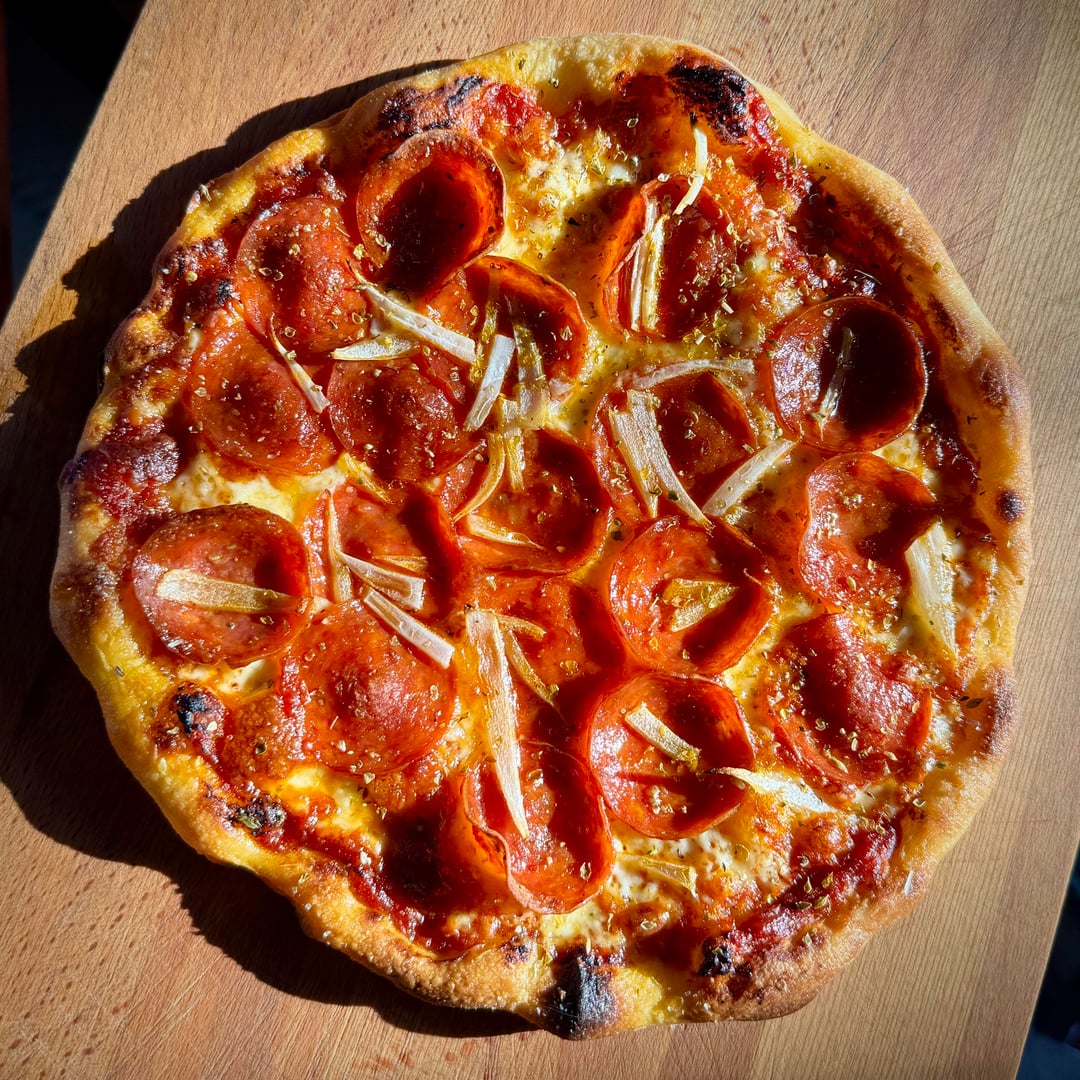 This happened — personal styles. High protein flour, 77% hydration, five day refrig ferment. 500° oven, 5mins on hi broil on middle rack (perhaps one min too long) and 4mins bottom rack. Once out of the oven: Garlic oil drizzle around the crust, sprinkle lots of oregano, and a bit of kosher salt around the rim. Also made same sized flat bread for my sweetie. It was so right 💯 Caught the sun at the end of golden hour for the pics