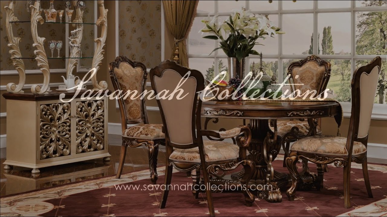 Newhaven 5-pc Dining Set available in Parisian Bronze finish. This collection features high-quality European fabric on the dining chairs, and exquisite details carved from solid Mahogany wood. The chairs have an elegant, antique quality that will create a luxurious dining experience. The circular table is meticulously carved with the highest craftmanship.