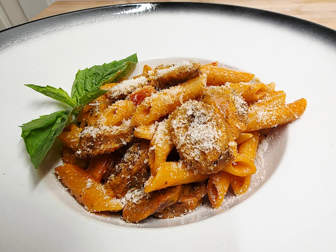 Started with hot Italian sausage, then added diced red and green peppers and shallots, some grated garlic. A squeeze of tomato paste, cooked that in then deglazed with vodka. Let that cook down x then added homemade passata and cooked it down a bit before going in with the cream. Killed the heat, added fresh grated parm and a bit of cold garlic and herb butter. Tossed in the pasta, and onto the plate