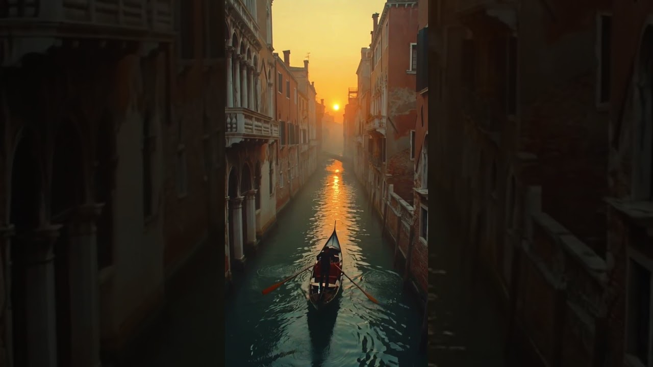 Cinematic Venice at golden hour. Gondolas gliding through ancient canals, sunset painting palazzo walls in amber and rose. Romantic Italian music designed for sophisticated dining venues where la dolce vita meets timeless elegance. Perfect for creating an atmosphere where guests are transported to the canals of Venice with every course.