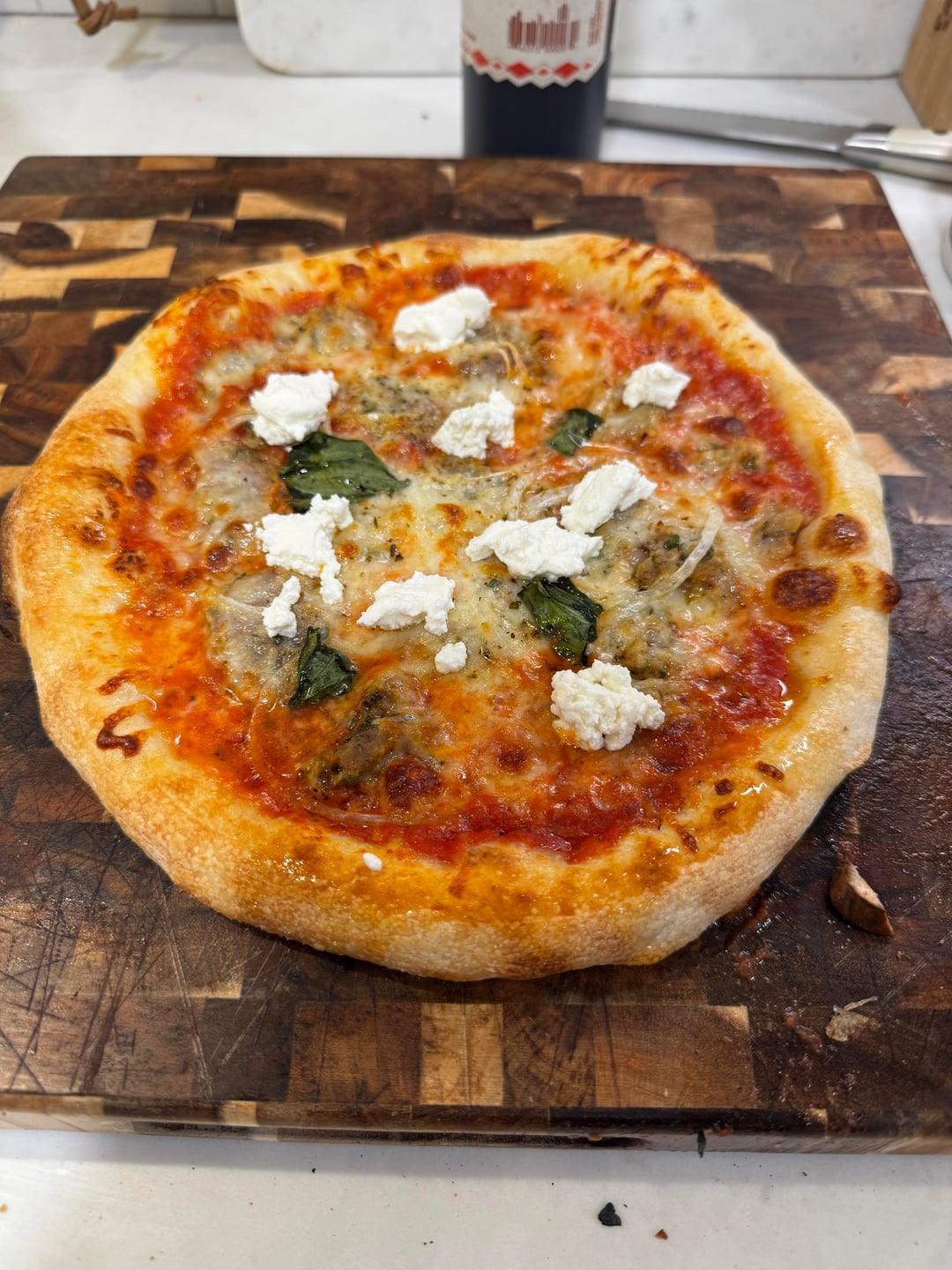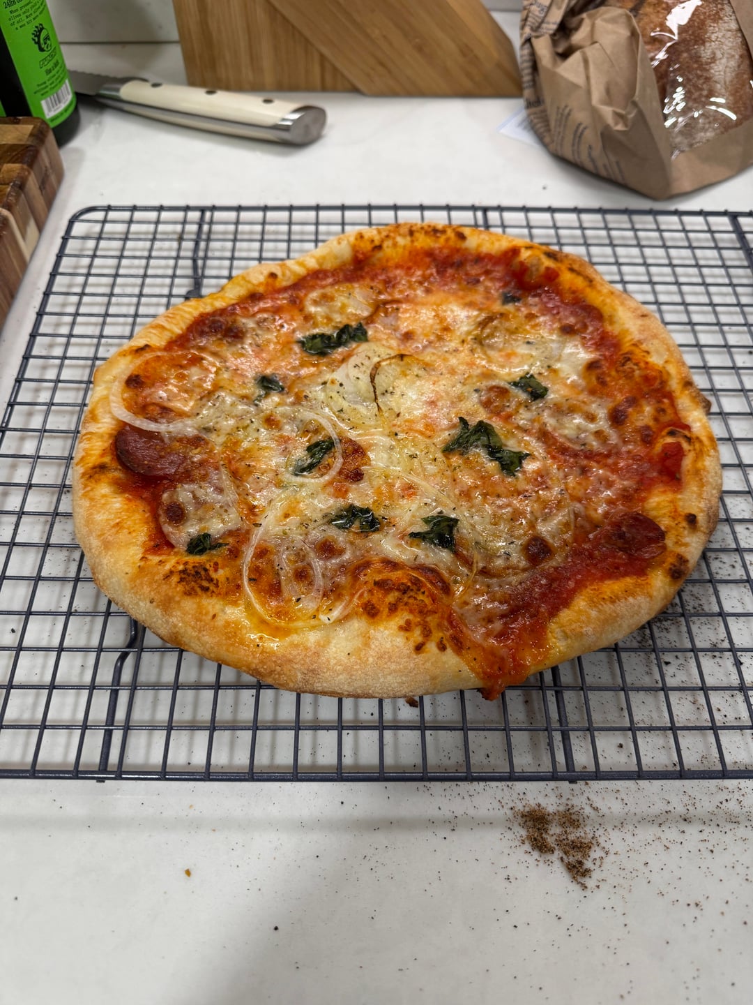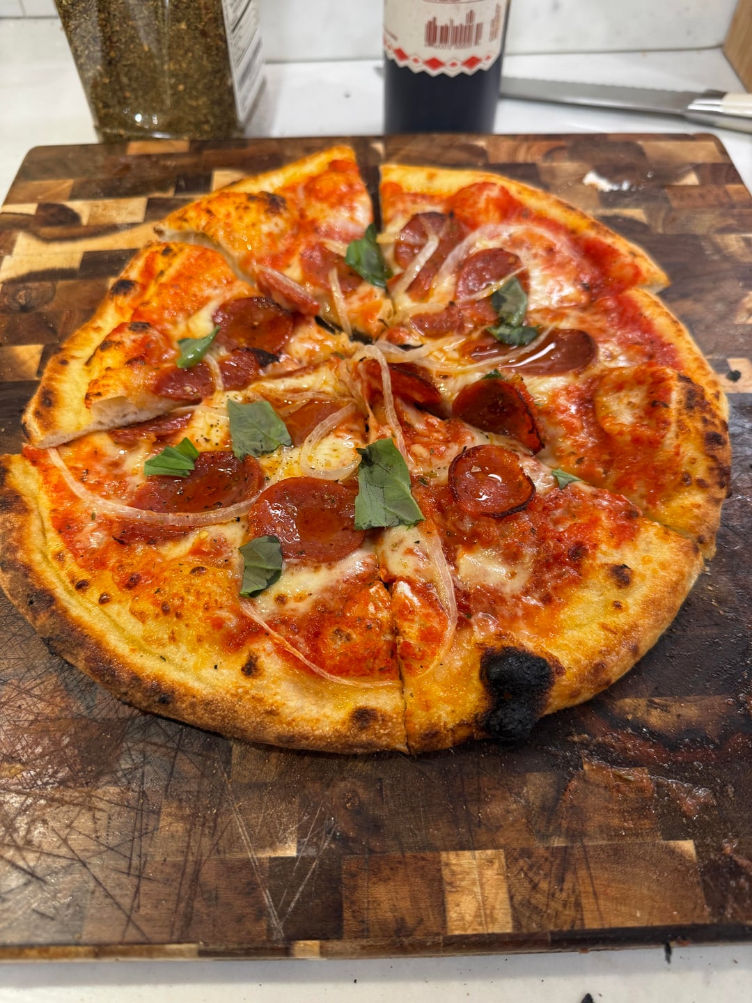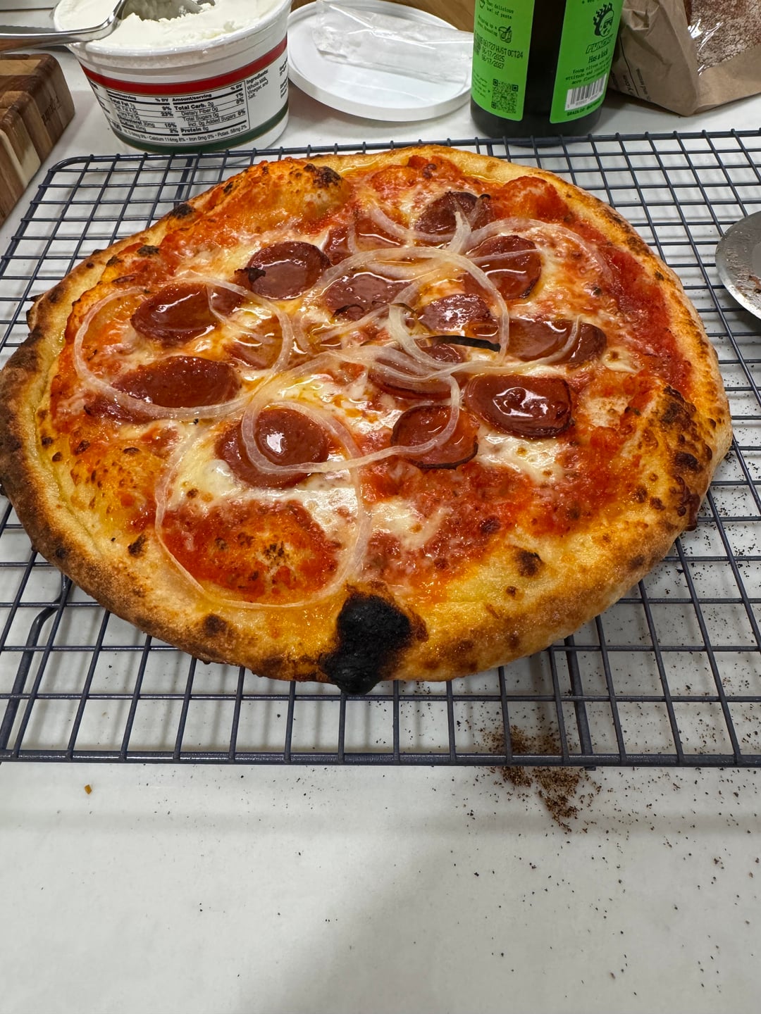Dough was made on Tuesday and cold fermented until Friday at noon. I let it relax for about five hours each do ball was 230 g each. I used Caputo pizzeria flour (845g), 507 g of water, 25 g of salt and 2.25 g of IDY yeast. That is 60% hydration and 3% salt. I opt the yeast a bit from my normal recipe and feel like it was too much. But the cold fermentation gave the dough a nice flavor.