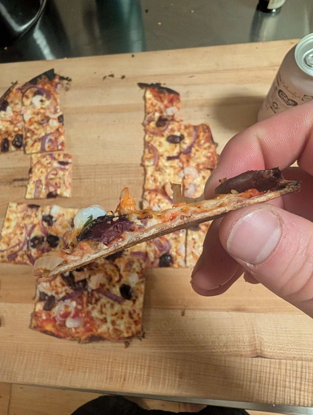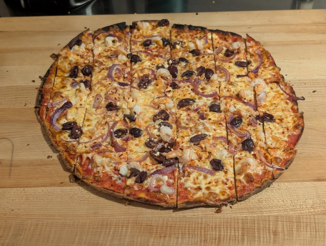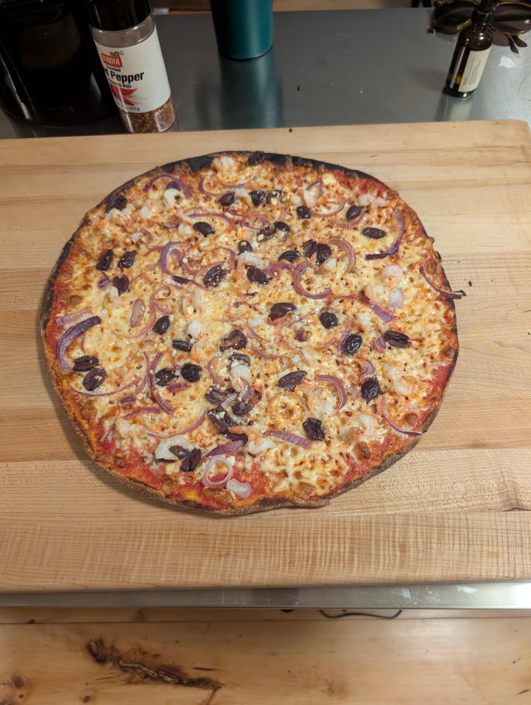 Used the Chicago Thin crust recipe from NY times/ J. Kenji Lopez Alt. I've done the Italian sausage and giardiniera combo a few times and wanted to switch it up to a combo my father would use for his homemade pizzas. Shrimp with feta/red onion/kalamata olives. Will add some sauteed spinach with garlic next time. This dough ball had a week-long cold ferment in fridge before rolling and curing overnight on parchment paper