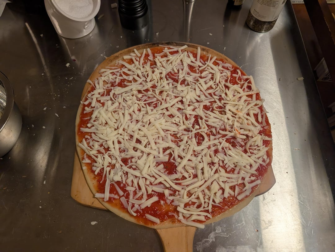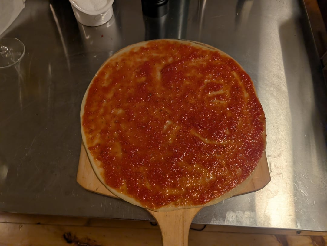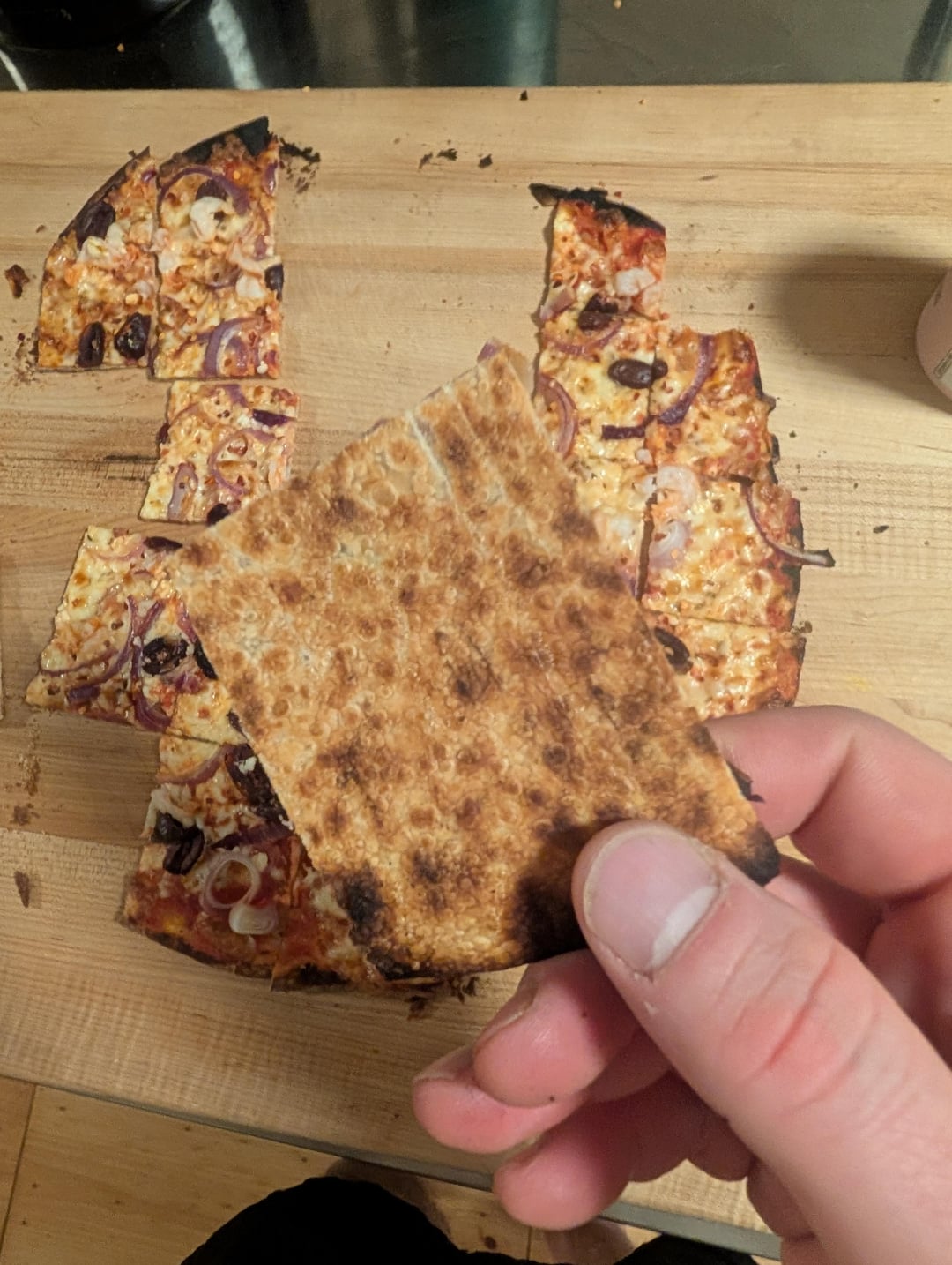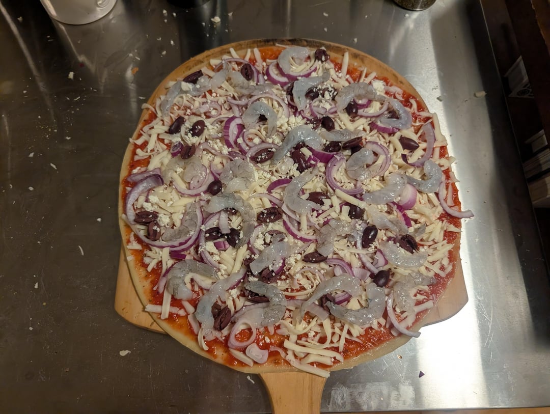 Used the Chicago Thin crust recipe from NY times/ J. Kenji Lopez Alt. I've done the Italian sausage and giardiniera combo a few times and wanted to switch it up to a combo my father would use for his homemade pizzas. Shrimp with feta/red onion/kalamata olives. Will add some sauteed spinach with garlic next time. This dough ball had a week-long cold ferment in fridge before rolling and curing overnight on parchment paper