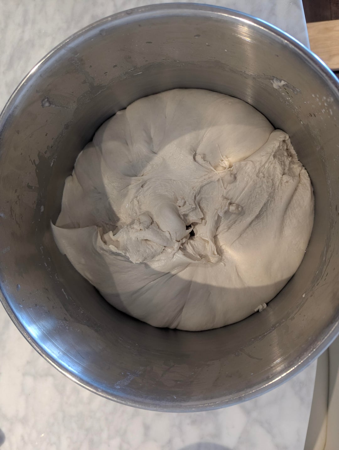 I normally will scrape the bowl while I'm incorporating just to be sure everything gets in there. This dough I made this weekend I resisted the urge to scrape and see how the machine will do. After about 10mins I had a nice clean bowl with a pumpkin inside. Dough comes out strong and smooth. I'll leave it in the bowl for 30mins after mixing with a damp towel covering it. I'll then make a large ball that I let rise under some plastic wrap for 2 hours. It is then partitioned and into the fridge.