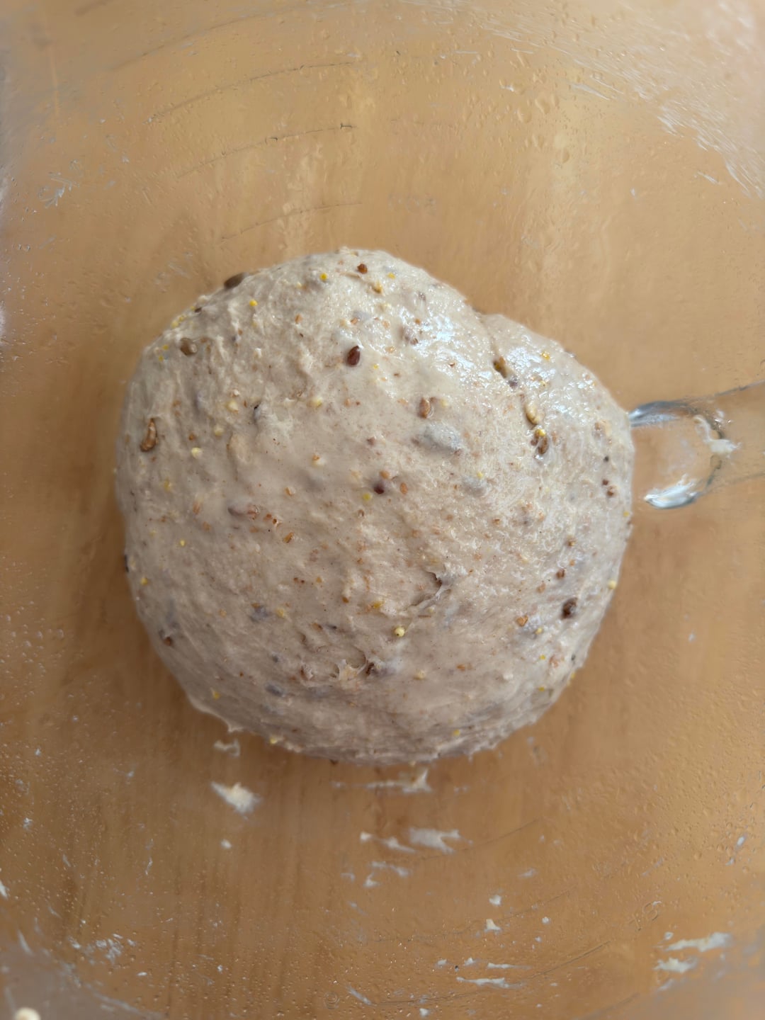 hydrate flour , add yeast , add oil , add honey 8 mins in kitchen aid , add salt at last minute and get rid of grain texture , poss a lil sprinkle extra four to make sure it’s not tacky or gooey , if it slides of dough hook easy , let bulk proof room temp 4-6 hours