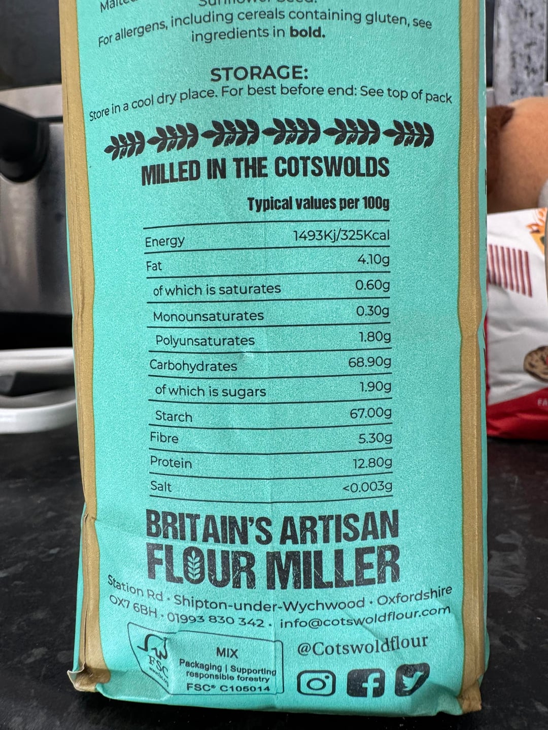 400g whole wheat flour (darker the better more grains etc bran etc) I tried Alison and dove organic this was for me the best and most versatile flour