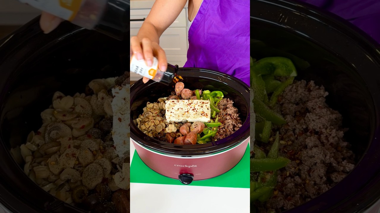I make a cheesy Italian sausage tortellini bake in the slow cooker with smoked chicken sausage, ground beef, bell peppers, mushrooms, olives, and cream cheese.