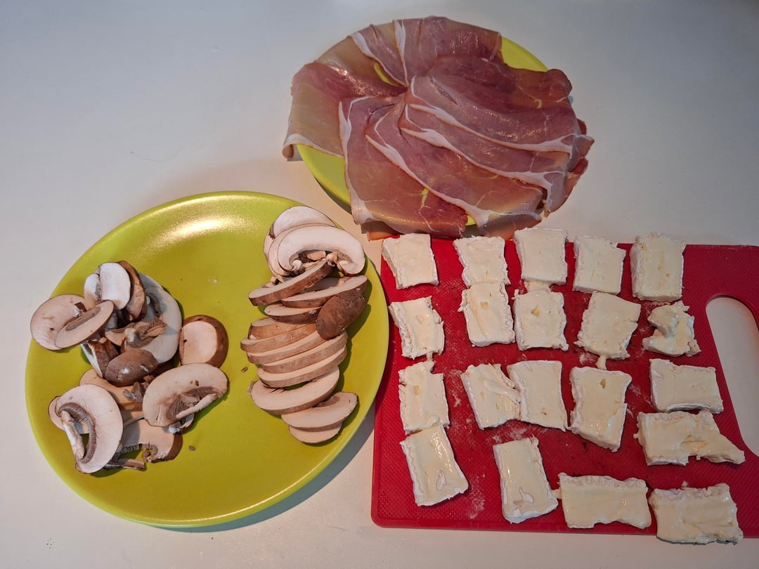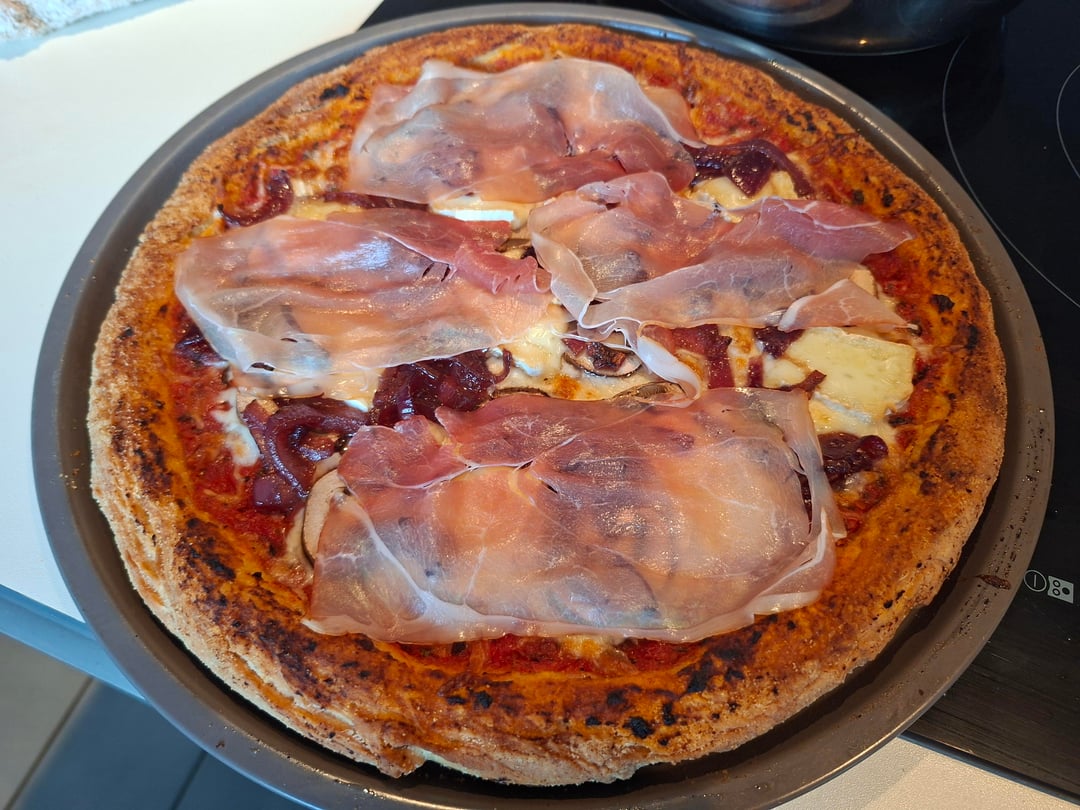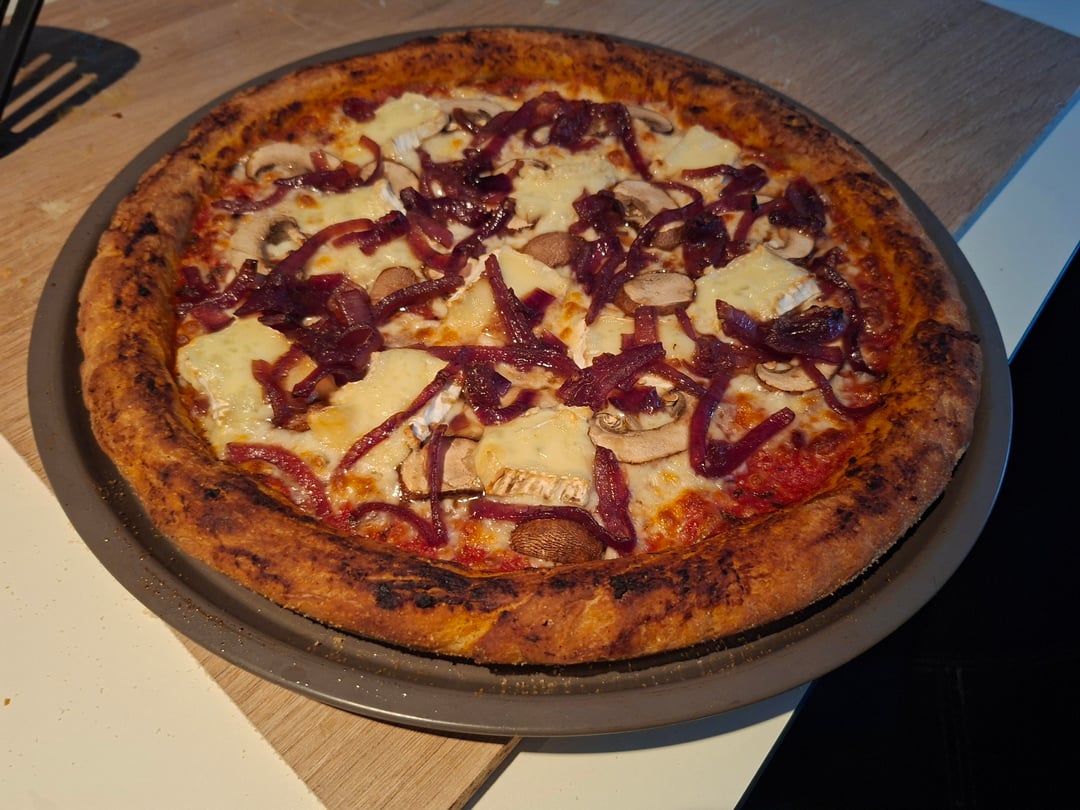 Tomato base with oregano, mozza, mushrooms, caramelized onions, brie, smoked ham.