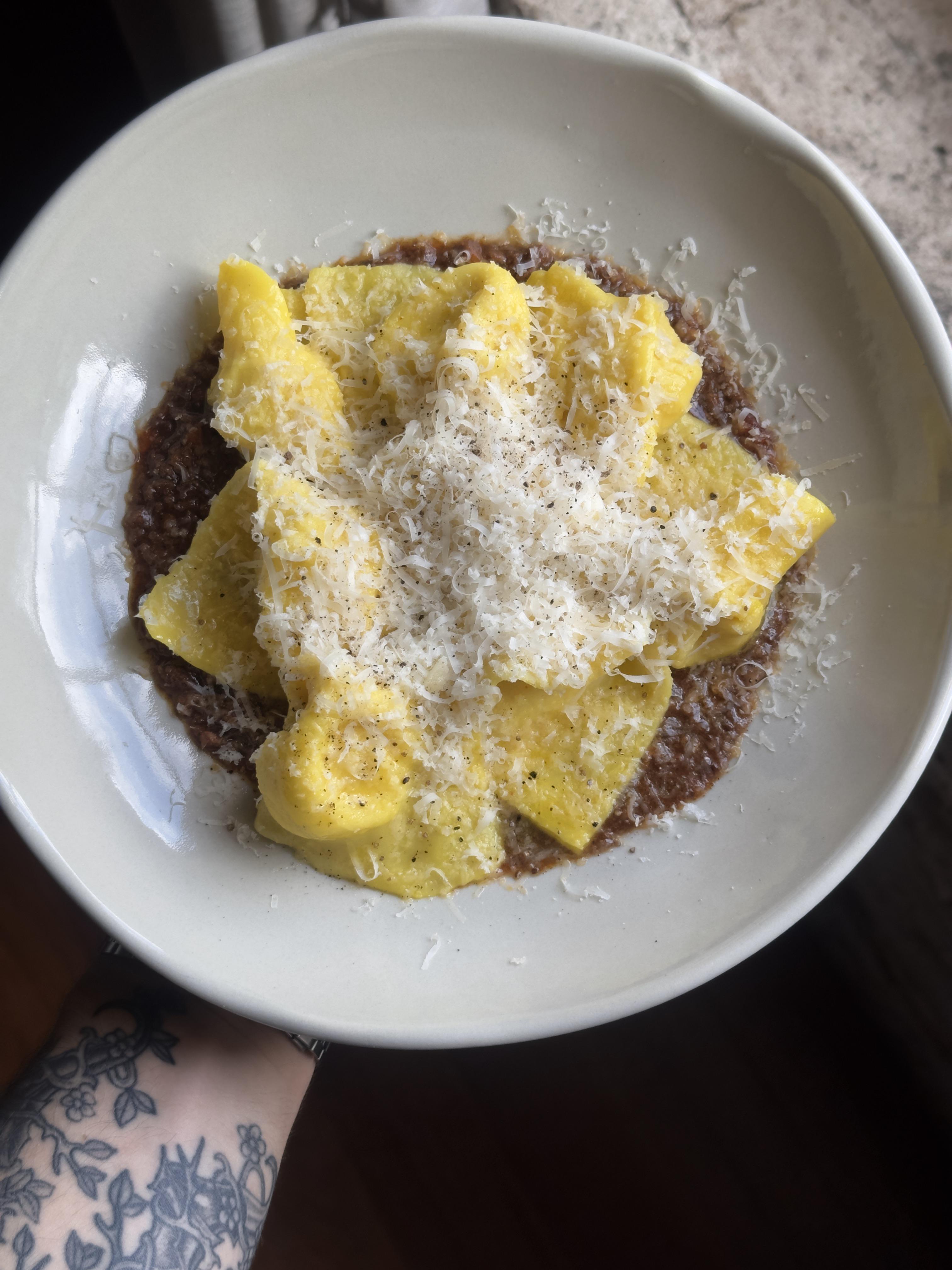The Cappellacci is cooked then sautéed in saffron butter. The bolognese is suuuper earthy and intense (5 hour cook).