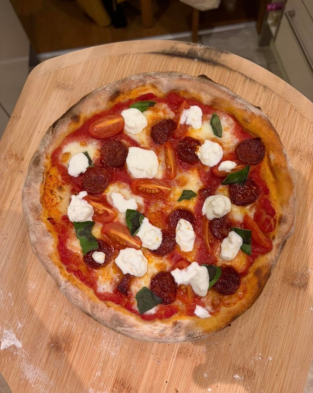 Chilli chorizo, mozz, basil, cherry tomato topped with basil. Still an issue with slight burning on the bottom, I think it is because in either using flour, and too much – does semolina help with this? And/Or not brushing my stone between bakes?