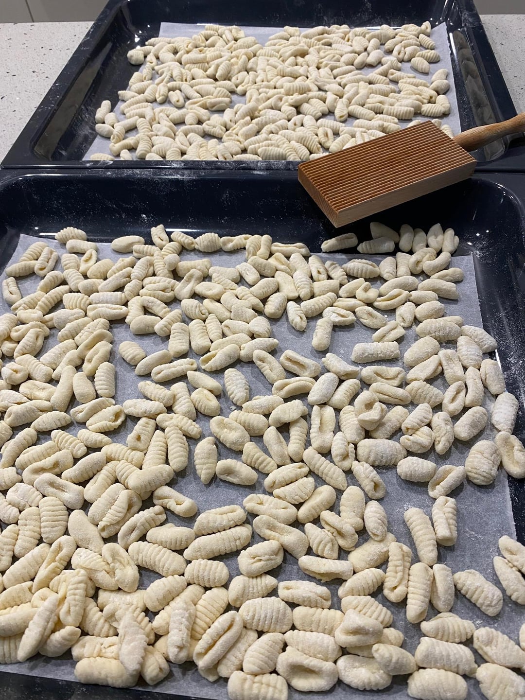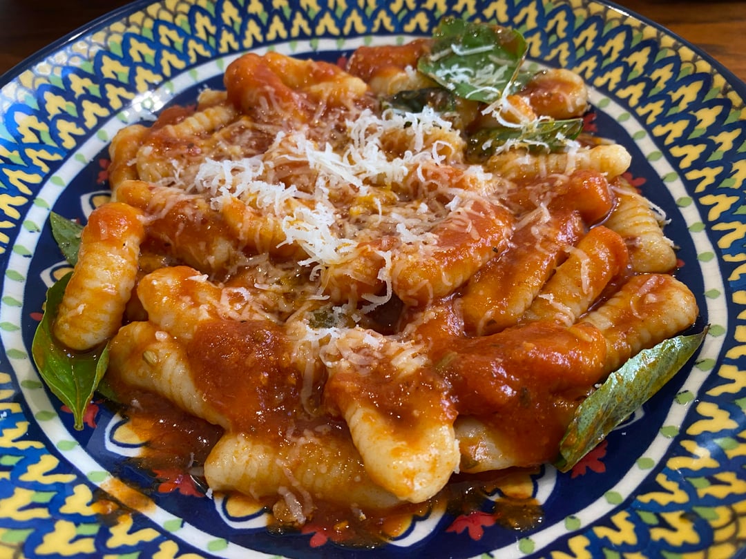 500gm Ricotta, 500gm Flour, 1 teaspoon salt, 1 egg, 1/4 cup water. Mix the ricotta and beaten egg. Add flour and salt and mix, then start adding water until you can get the dough to form a ball, but still fairly dry. Cover with plastic and let sit for about 30 minutes. Take a piece of the dough, roll into a strip about 1cm thick and cut into pieces about 2.5cm long. A 2nd person should be taking these pieces and shaping them on the gnocchi roller, placing the cavatelli on a platter covered with wax paper and dusted with semolina. The person cutting the pieces should, from time to time, pause and criticise the shape and appearance of the cavatelli produced by the 2nd person. Freeze the cavatelli before cooking, overnight is best.