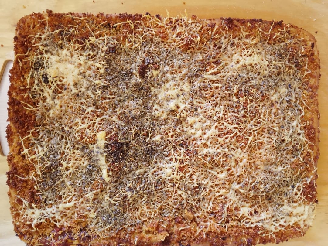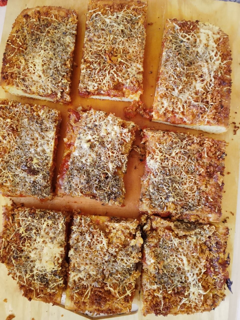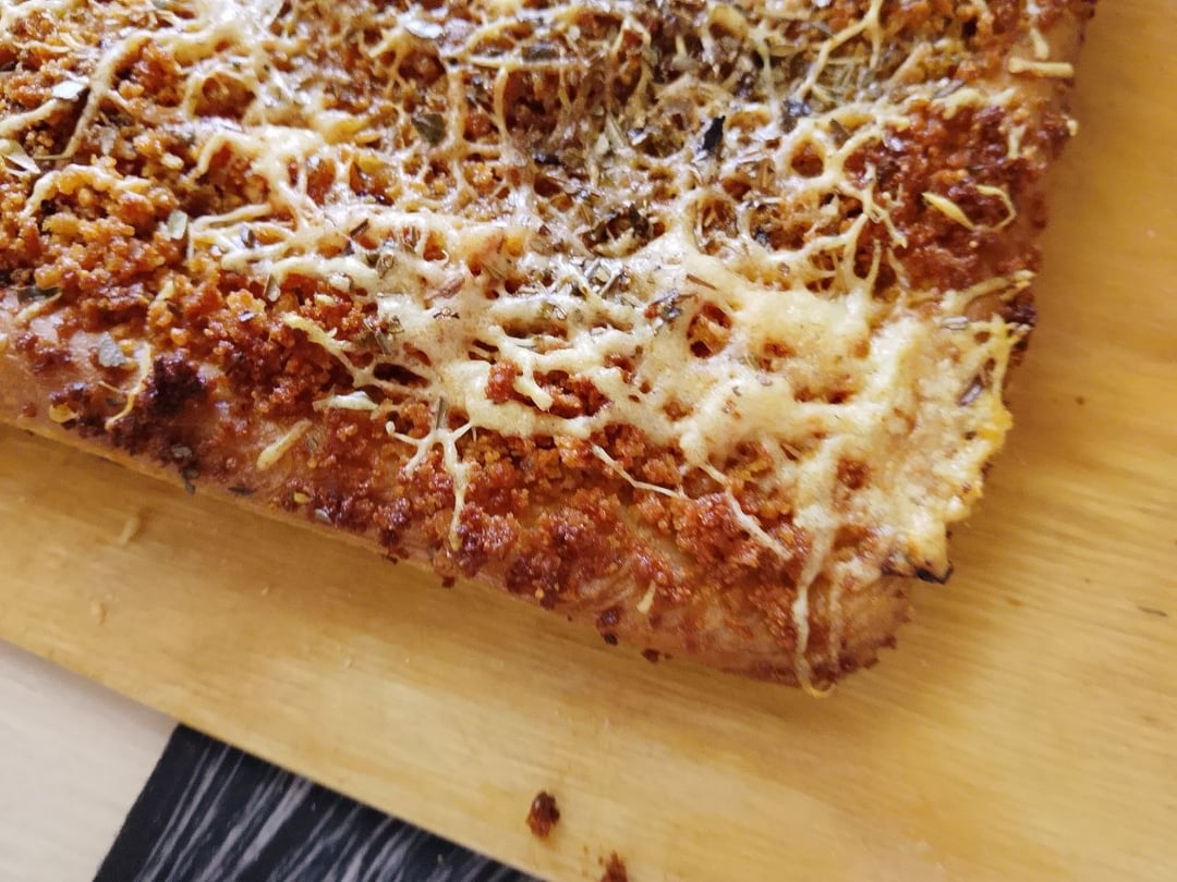 Sprinkle the pizza with breadcrumbs (you may have some crumbs left over), grate cheese on top, and add dried oregano. You can also drizzle the pizza with olive oil.