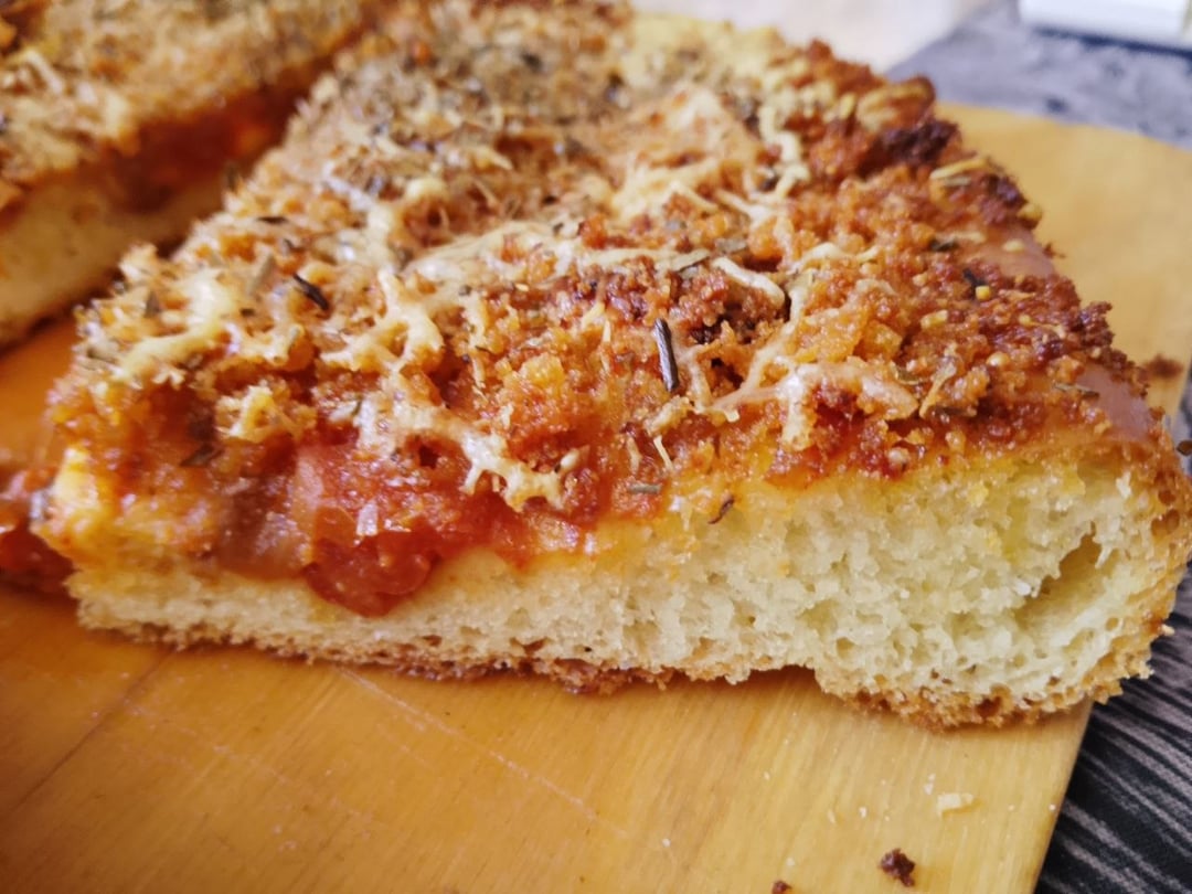 Prepare the sauce (it can be stored for up to 1 week in the refrigerator, in a covered bowl): Finely chop the onion. Heat the olive oil and onion in a saucepan over medium-high heat until sizzling. Continue cooking, stirring frequently, until the onion turns a deep golden brown, about 20 minutes total. Tear the tomatoes into large pieces with your hands. Add them to the saucepan with the onions (along with half of the juice) and stir. Bring to a boil, then reduce the heat to low and cook, stirring occasionally, until the sauce is a deep red and thick, about 30 minutes. Season with salt to taste and set aside. Any sauce left over after making the pizza can be frozen in a sealed container. Make bread crumbs (they can be stored for up to 3 days in a covered container at room temperature): Slice the bread into pieces about 1.25 cm thick. Place the oven rack in the middle position and preheat the oven to 150 °C. Spread the bread slices on a rimmed baking sheet and bake until completely dry, about 30 minutes (you can flip the bread slices halfway through baking). You can also toast the bread in a toaster on low heat (but don’t brown it—the bread should just become dry). Break the bread into large pieces with your hands, then transfer to a food processor. Add the olive oil and the cheese grated on a coarse grater, and process until finely crumbled. Any crumbs left over after making the pizza can be transferred to a zip-top bag and stored in the freezer.