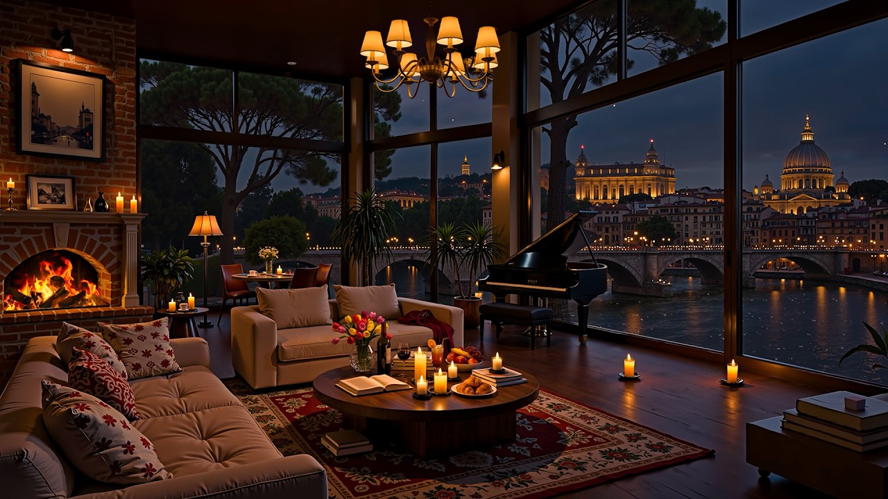 As smooth jazz saxophone melodies fill the room, they blend seamlessly with the serene night view of Rome, creating a tranquil ambiance perfect for relaxation, stress relief, or drifting into a peaceful sleep.