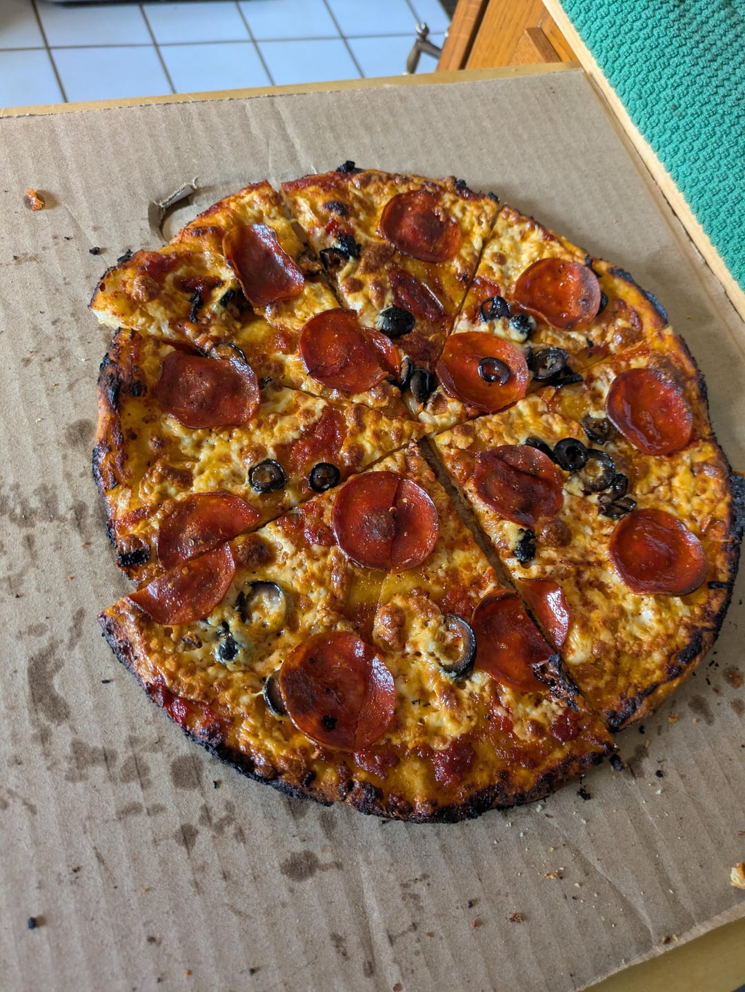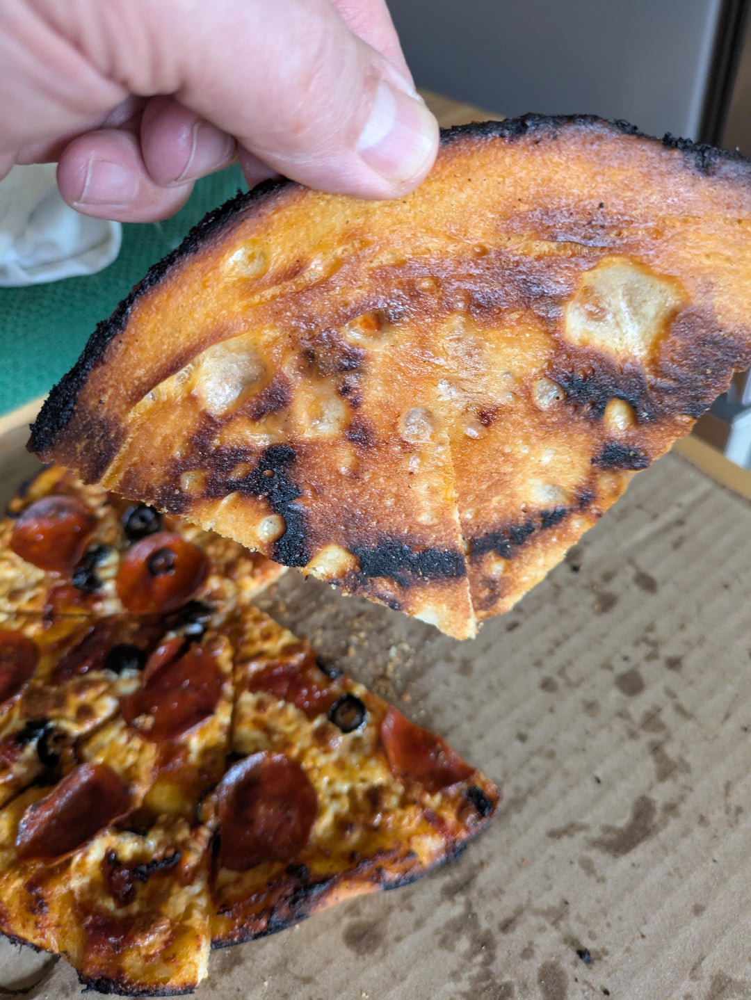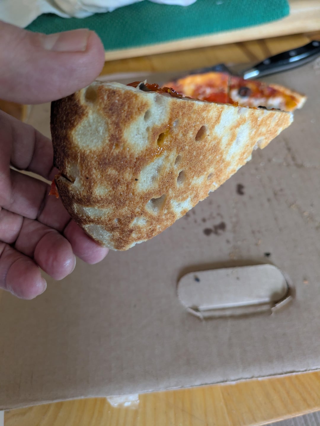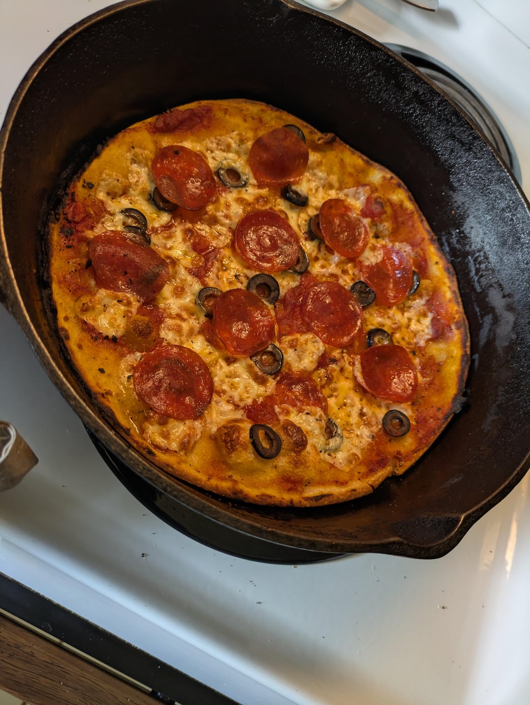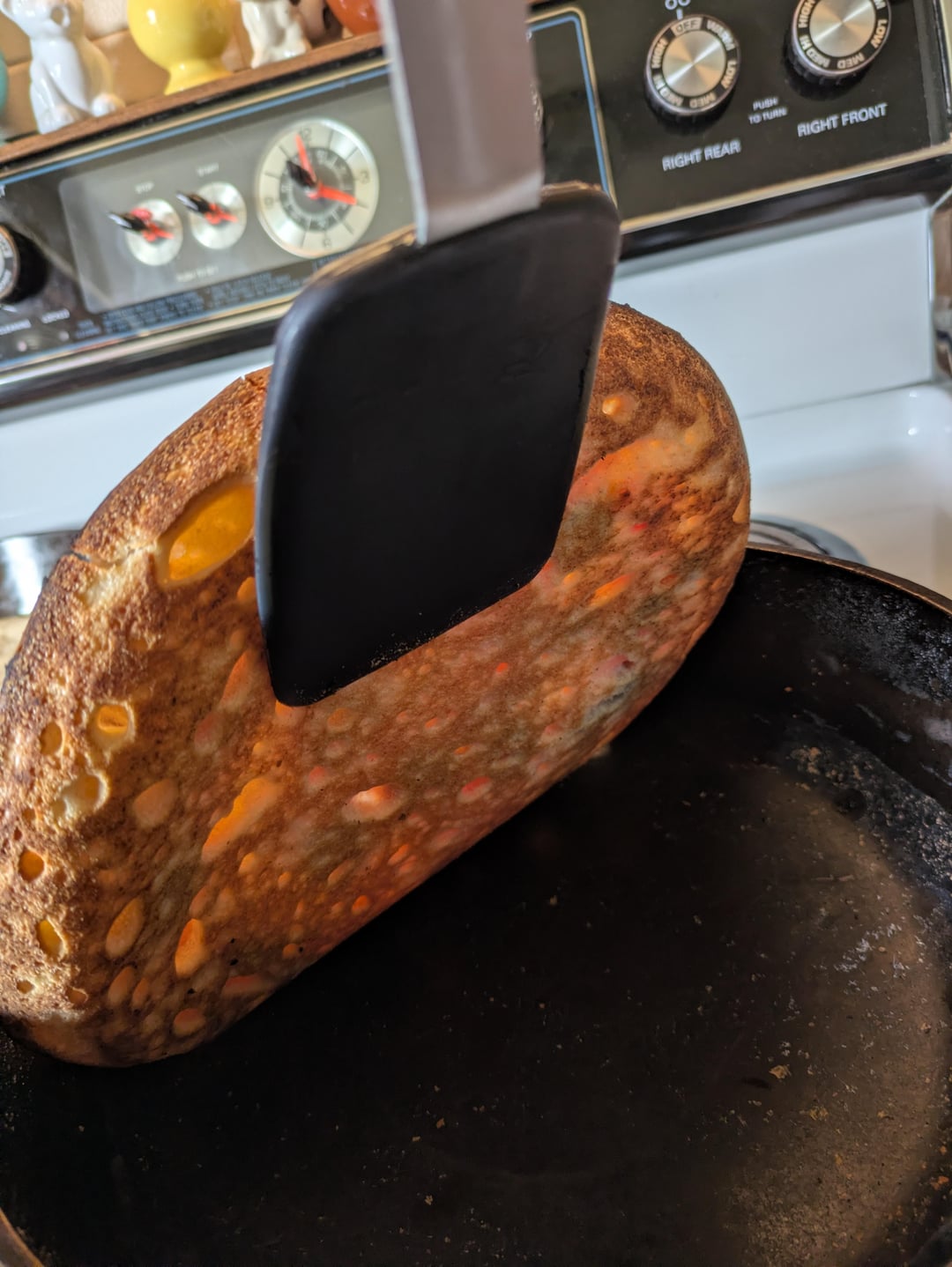 When the top was done I tried to help it on the stove top but then it wanted to burn…so back into the turned off oven to crisp the crust….the top was maybe over done …my wife likes them on the well done side so it worked out.