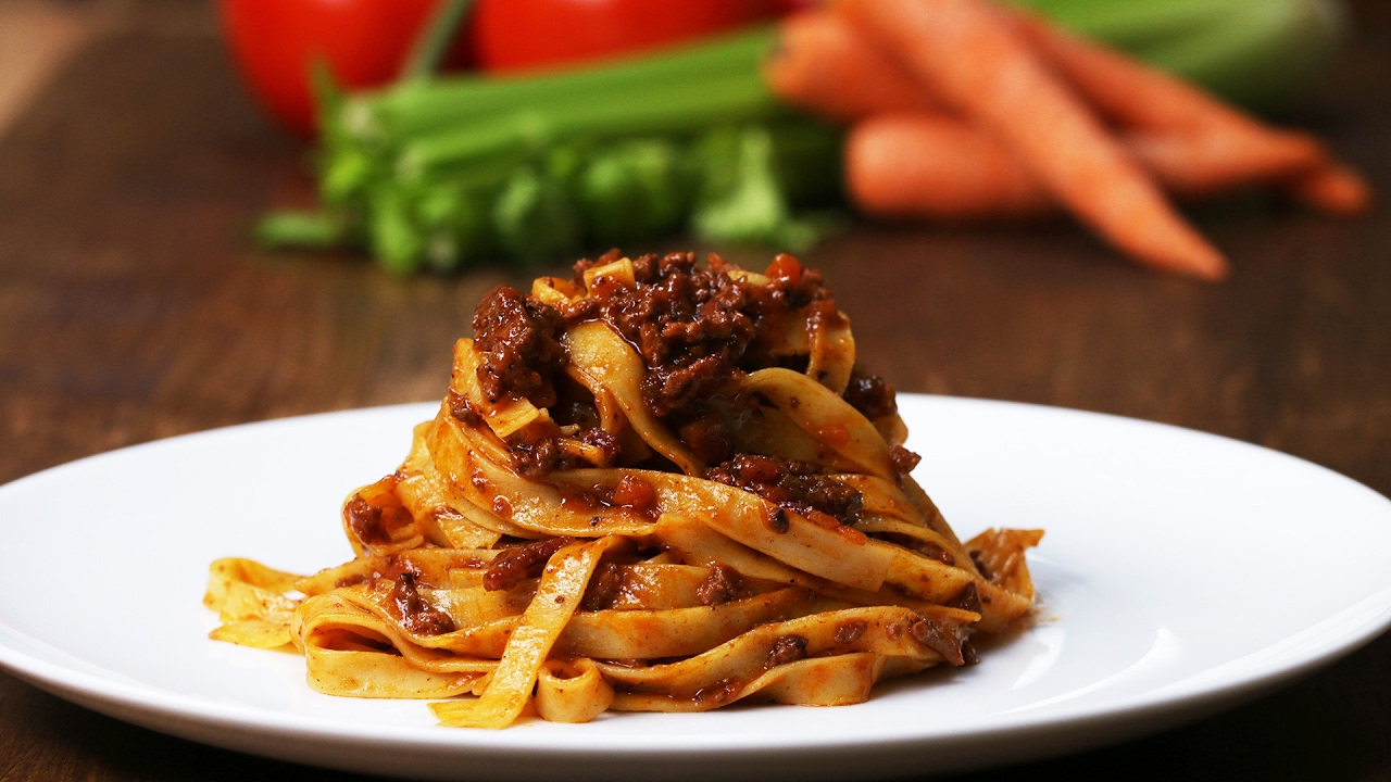 6. To serve, cook desired pasta and toss in the bolognese. Top with parmesan cheese and enjoy!