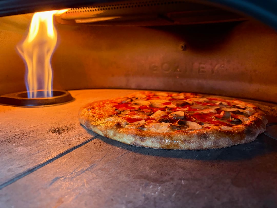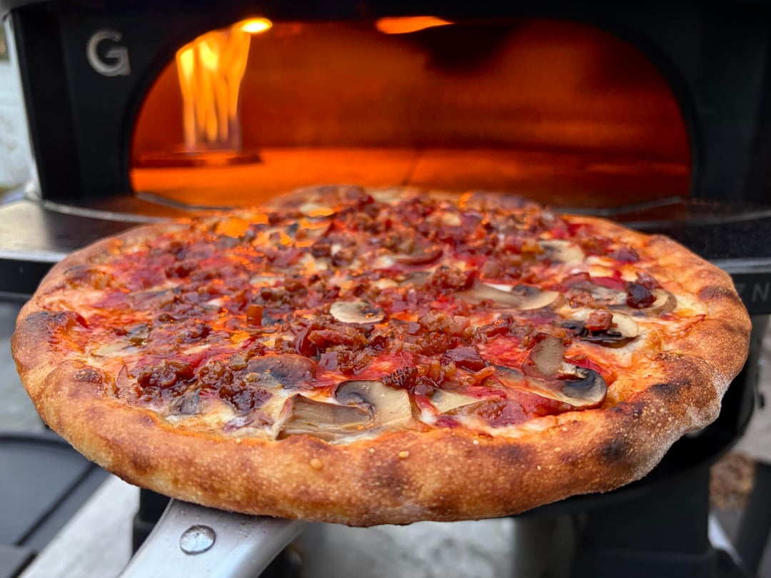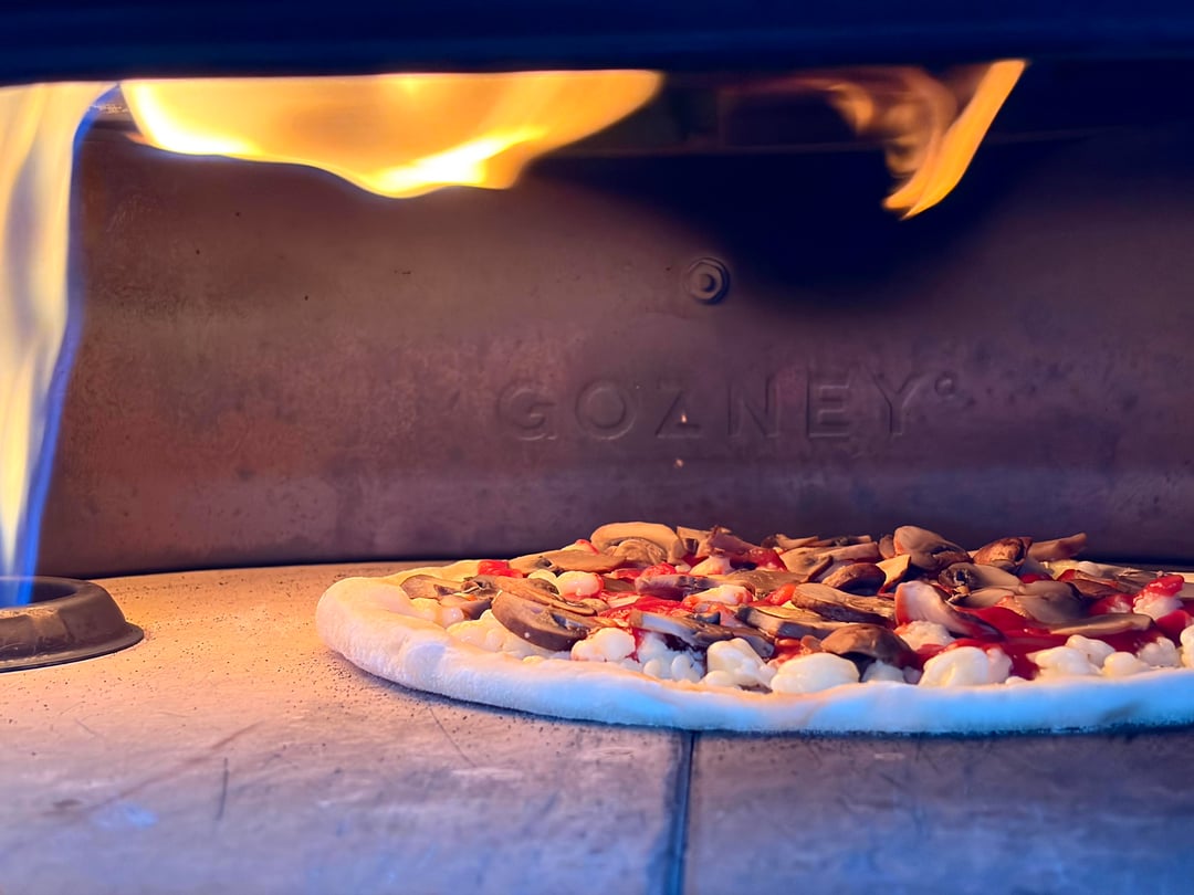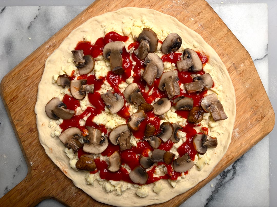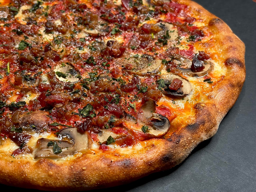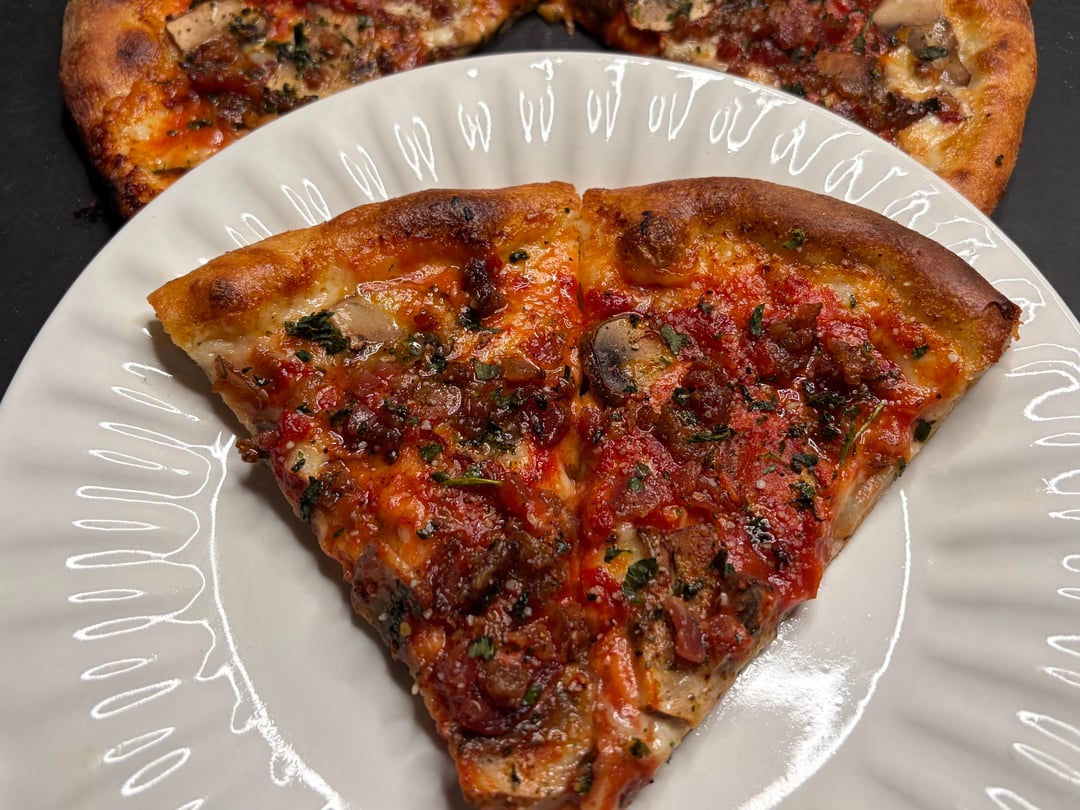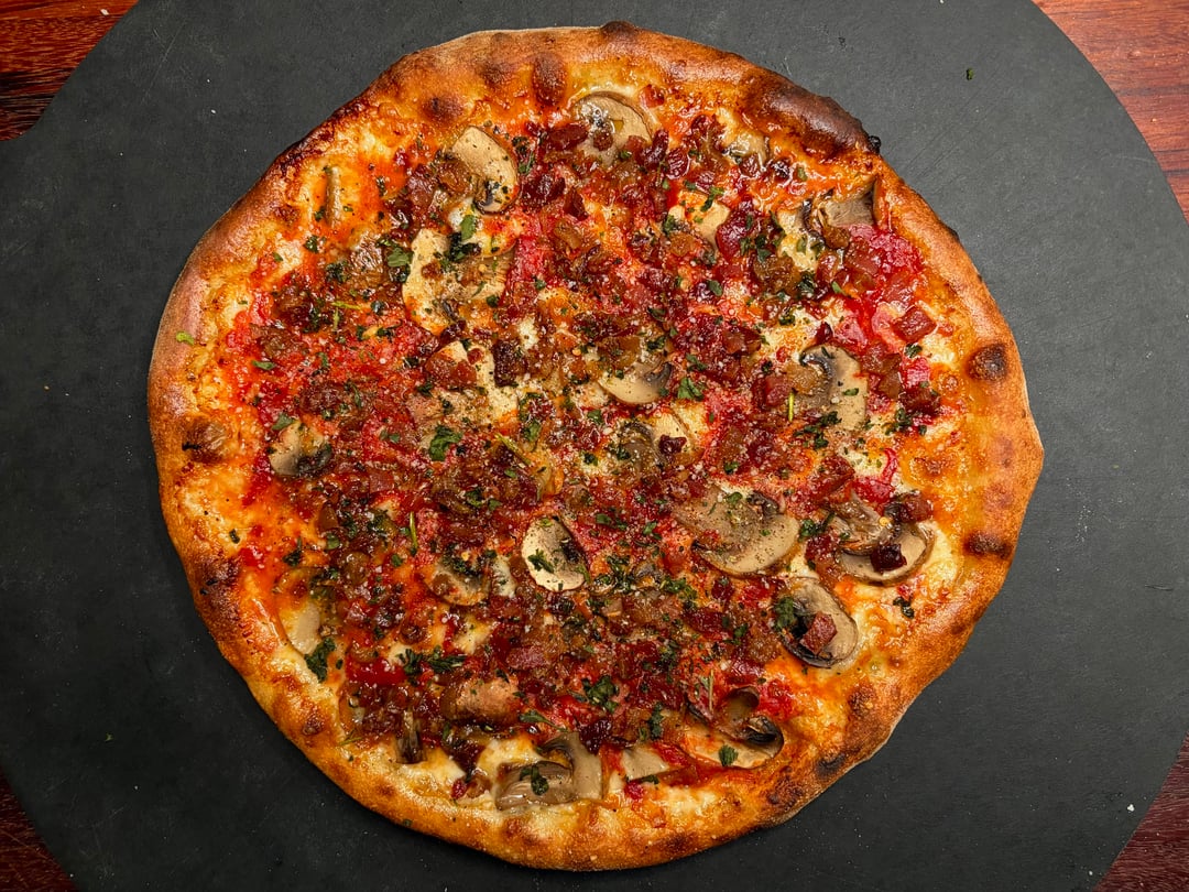Pizza night! This week’s special had Mozzarella, Provolone, and smoked Scamorza, tomato sauce, crimini mushrooms, and grated Pecorino Romano. Bacon crumbles were added for the last couple of minutes in the oven, then finished with more Pecorino and dried herbs.
